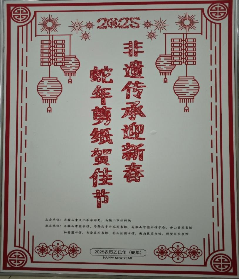 为大力弘扬中华优秀传统文化,传承非物质文化遗产,2025年5月8日,一场别开生面的剪纸展览活动——“非遗传承迎新春·蛇年剪纸贺佳节”在beat365正版唯一入口必一图书馆(霍里山校区)一楼大厅举行。此次活动由马鞍山市文化和旅游局、马鞍山市社科联主办,beat365正版唯一入口必一图书馆承办。