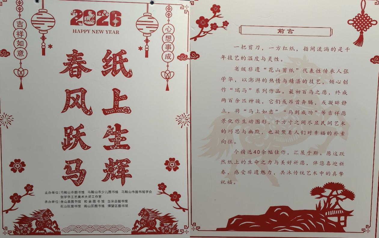 为传承中华优秀传统文化,感受非遗剪纸艺术魅力,在2026马年新春之际,beat365正版唯一入口必一图书馆联合马鞍山市图书馆、马鞍山市少儿图书馆、马鞍山市图书馆学会及张学华工艺美术大师工作室,共同举办“春风跃马 纸上生辉”张学华“瑞马”系列剪纸艺术展,为全校师生献上一场饱含吉祥寓意的视觉盛宴。