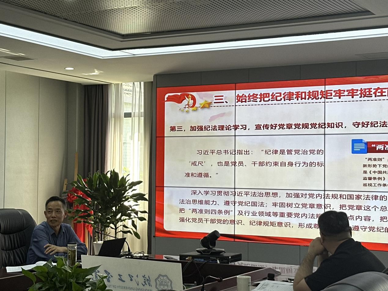 会上,校党委书记丁家云上了题为《学党纪筑牢规矩“防火墙”——使守规矩、讲规矩成为行动自觉》的专题党课,丁家云围绕党纪学习教育的重要性和必要性,从“提高政治站位,深刻认识开展党纪教育的重要性”、“把握学习重点,推动形成守纪律、讲规矩的高度自觉”以及“始终把纪律和规矩牢牢挺在前面,确保敬畏纪法,踔厉奋发,笃行不怠”等三个方面,作了深入讲解和系统辅导。要求全校党员干部要牢固树立党章意识、纪律规矩意识,始终把纪律和规矩停在前面,为学校的高质量发展和中国式现代化建设做出更大贡献。