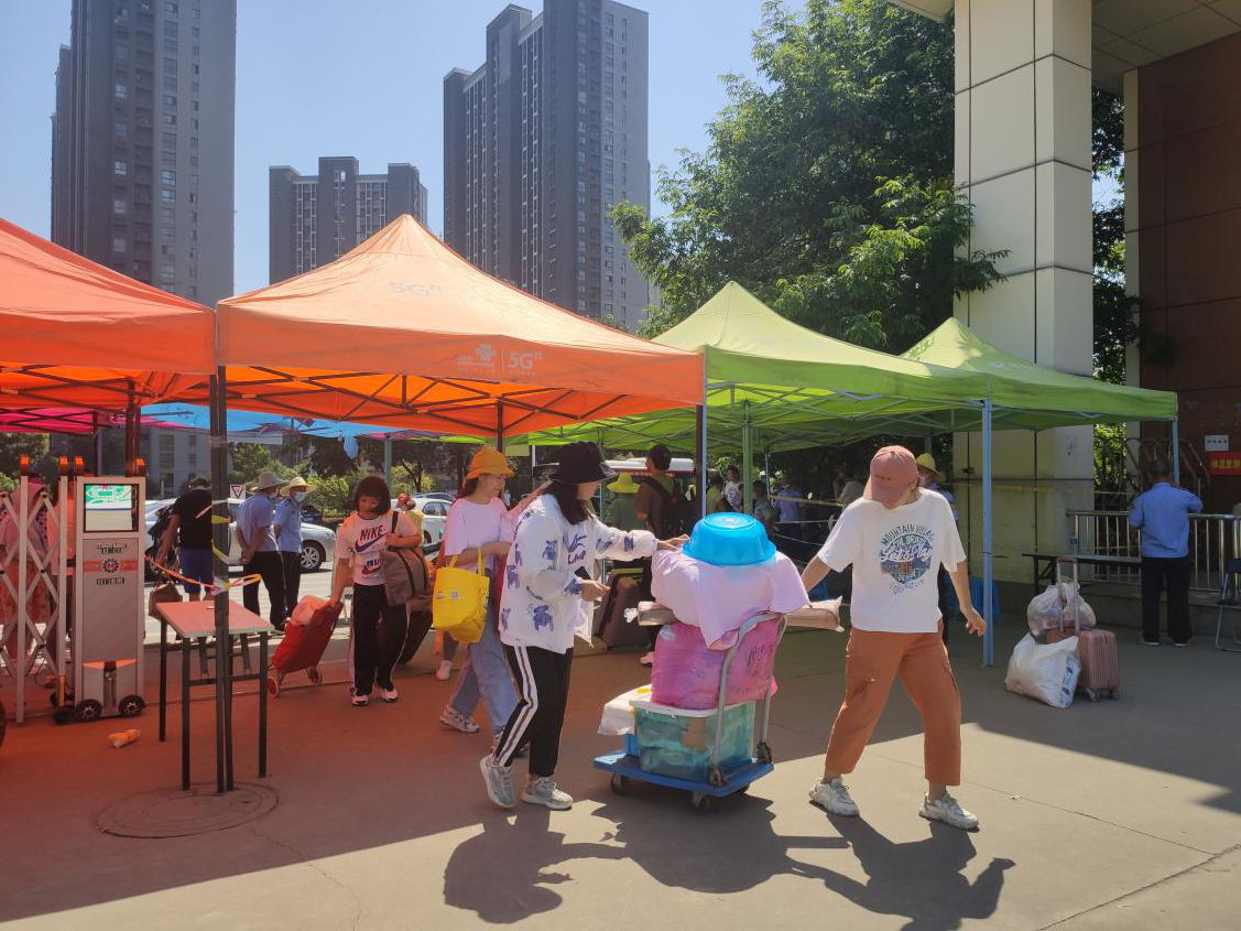 在返校入口处,同学们有序排队,逐一出示健康码、测量体温后进校。学校组织工作人员和学生志愿者现场协调,并设置应急处置点。进校后,在宿舍管理站,同学们在返校名单上签字,测量体温后陆续回到寝室。学校还为每个宿舍提供温度计、洗手液等防疫物资。