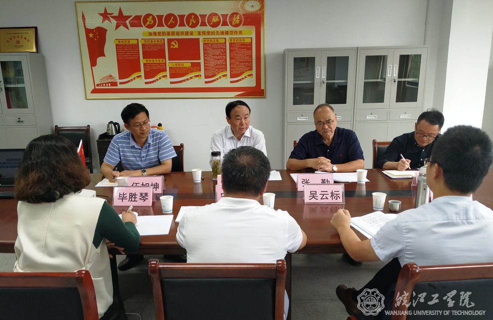 在E218会议室,吴云标向刘志祥一行介绍了基础部教师现状及下设科室情况,汇报了年初以来基础部在疫情防控、教学、科研、党务等方面开展的各项工作,并代表基础部感谢校领导一直以来对基础部的关心和支持。此外,吴云标也谈到基础部工作中还存在的不足,并提出相应的工作思路。宋洪生就今后的党建工作思路和重点工作方向向校领导做出汇报。