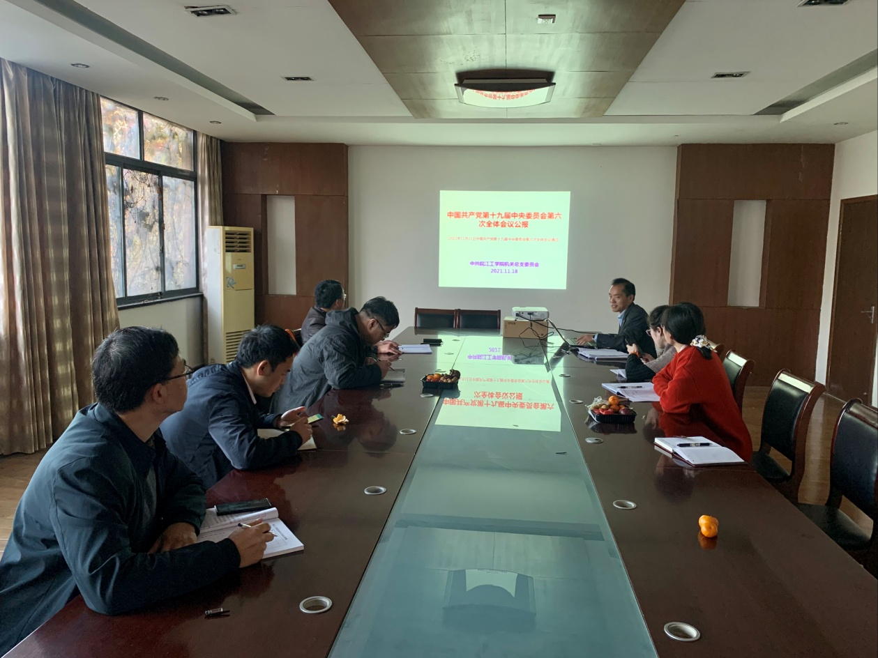 11月18日下午,机关党总支在行政楼F312召开学习会议,专题学习党的十九届六中全会精神。组织委员胡耀东领学,全体总支委员参加。总支书记王志主持学习会议。