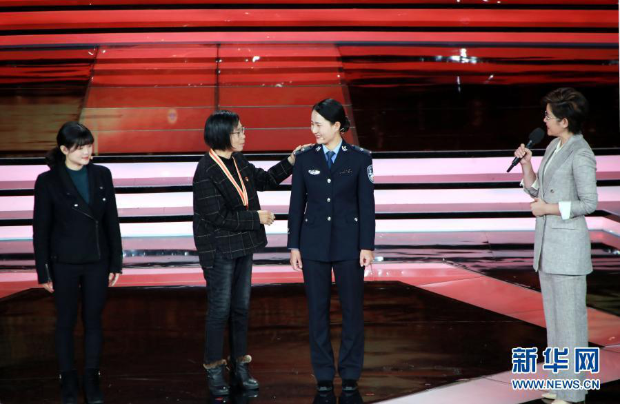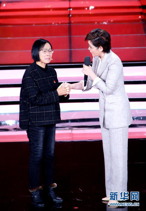 张桂梅(左)在“时代楷模”发布仪式上与主持人交流(12月7日摄)。新华社记者 潘旭 摄