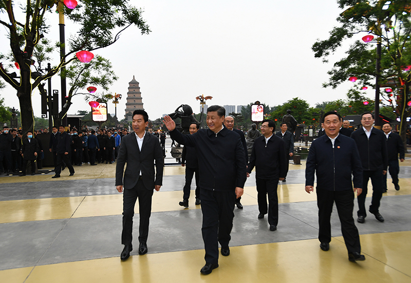 4月20日至23日,中共中央总书记、国家主席、中央军委主席习近平在陕西考察。这是4月22日,习近平在西安大唐不夜城步行街考察时,向游客挥手致意。
