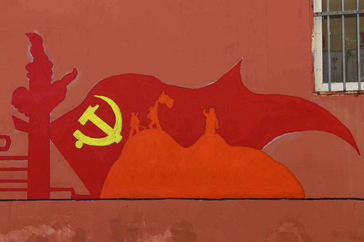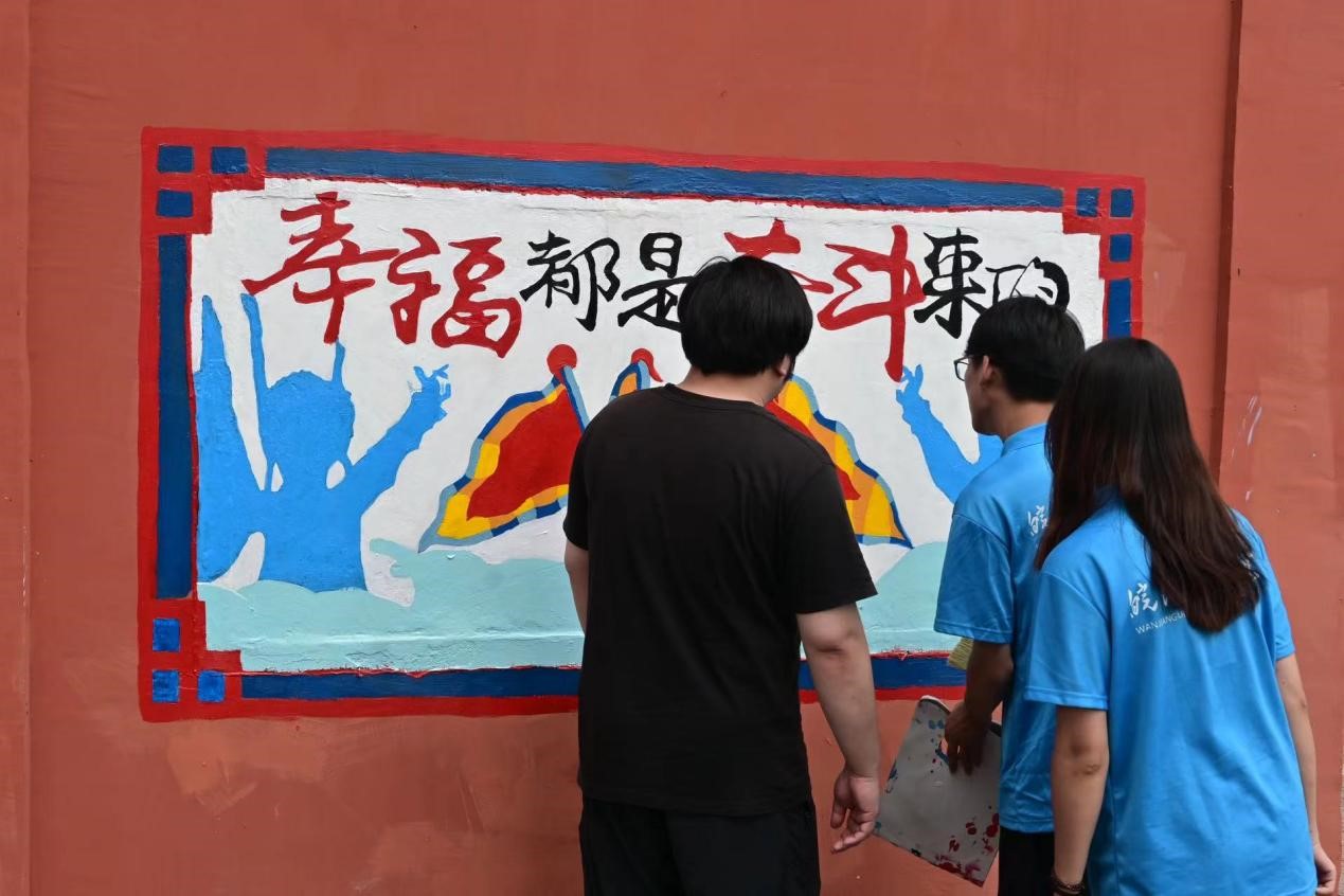 此次墙绘的整体内容以非遗文化泗州戏和优良学风为主,立意深远、主题鲜明。在团队成员的默契配合与不辞辛苦地劳作之下,墙绘的内容日渐丰富、逐步完善。然而,天公不作美,施工期间受到天气影响,时而下起淅淅沥沥的小雨。但团队成员的创作热情丝毫未减,他们充分利用下雨的空隙争分夺秒地继续完成墙绘工作。最终,在克服了天气、环境等一系列困难之后,墙绘工作圆满完成,精美的墙绘内容获得了沟乡桃沟中心校教师们的高度肯定。