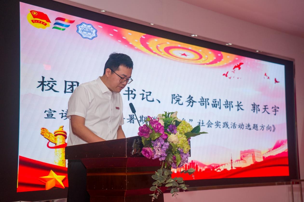随后,校团委副书记、院务部副部长郭天宇宣读《beat365正版唯一入口必一2025年大学生暑期“三下乡”社会实践活动选题方向》,重点围绕习近平新时代中国特色社会主义思想宣讲、爱国主义教育实践、中华文化传承、乡村振兴促进等十个方向开展实践活动。随后,领导老师为实践团队授旗,校党委副书记、副校长孙良为校级重点团队颁授实践基地铜牌。