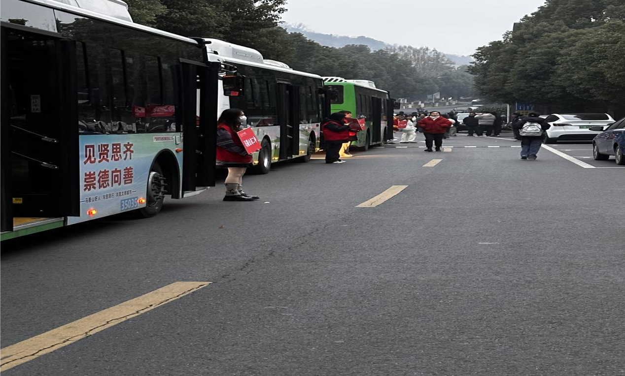 6时30分,12辆“研途巴士”整齐列队、蓄势待发。15名志愿者手持祝福牌沿途引路,有序引导考生登车。在朝阳的映照下,送考车队缓缓驶离校区,向着考点稳步前行。车队承载的不仅是奔赴考场的学子,更是学校对青年成长的深切关怀与全力支持,彰显着皖工学子为梦想拼搏的坚定姿态。