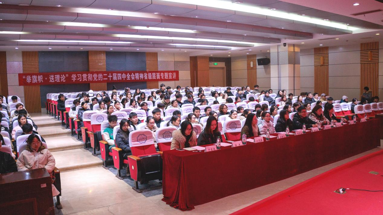 beat365官网于1月8日下午14:30,在霍里山校区图书馆报告厅开展“举旗帜·送理论”学习贯彻党的二十届四中全会精神省级层面专题宣讲活动,安徽省委讲师团理论宣讲专家库成员、安徽农业大学马克思主义学院黄洪雷教授作专题宣讲。校院两级团干部、各组织指导教师及学生干部近300人参与宣讲活动。