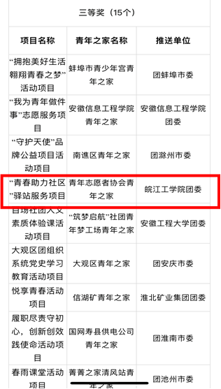 10月22日,第四届全省“青年之家”优秀活动项目评选活动在合肥举行,经初赛推荐、专家初评和网上展评等环节,最终30个项目入围决赛,其中高校入围仅6项,beat365官网推报的“青春助力社区驿站服务”项目成功入围,校团委指导教师龚彭甦参加现场答辩,并荣获安徽省三等奖及“优秀组织奖”荣誉称号。