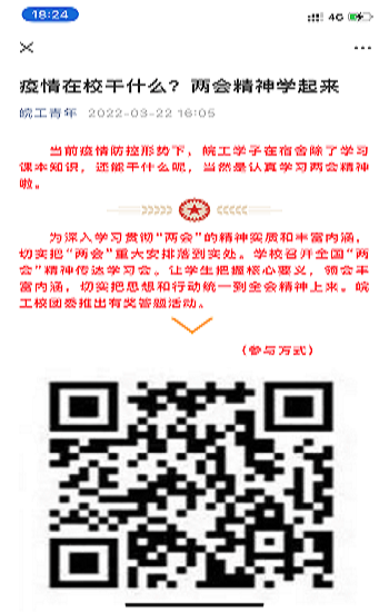 校团委聚焦主责主业,以思想政治引领为根本,团结带领广大青年开展“青年大学习”、两会精神学习等网络学习活动,学习覆盖率达90%。充分发挥基层团支部的的“战斗堡垒”作用,积极开展“请党放心,战疫有我”线上主题团日活动,把疫情防控伟大实践与青年团员思想引领相结合。调动各级组织的力量,制作专题短片、抖音视频,感悟防疫事迹、分享战疫故事,引导学生在抗疫精神中坚定战胜疫情的信心和决心。