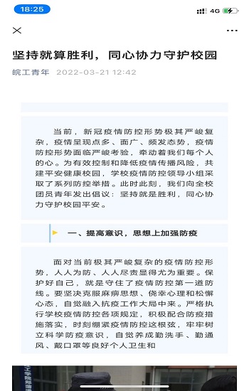 疫情发生后,校团委发出《关于招募“青年战疫”志愿者突击队力量的通知》,成立宣传信息、文体活动、文明纠察等志愿先锋队,确保校内志愿服务工作高效有序安全推进。建立校院两级团组织“线上线下”工作网络,先后向全校青年发布《疫情防控人人有责——致全体皖工青年的倡议书》、《疫情在校干什么?两会精神学起来》、《坚持就算胜利,同心协力守护校园》等通知,将组织力转化为抗击疫情的青春战斗力,号召各级团组织、团干部、团员青年扛起责任彰显使命担当。