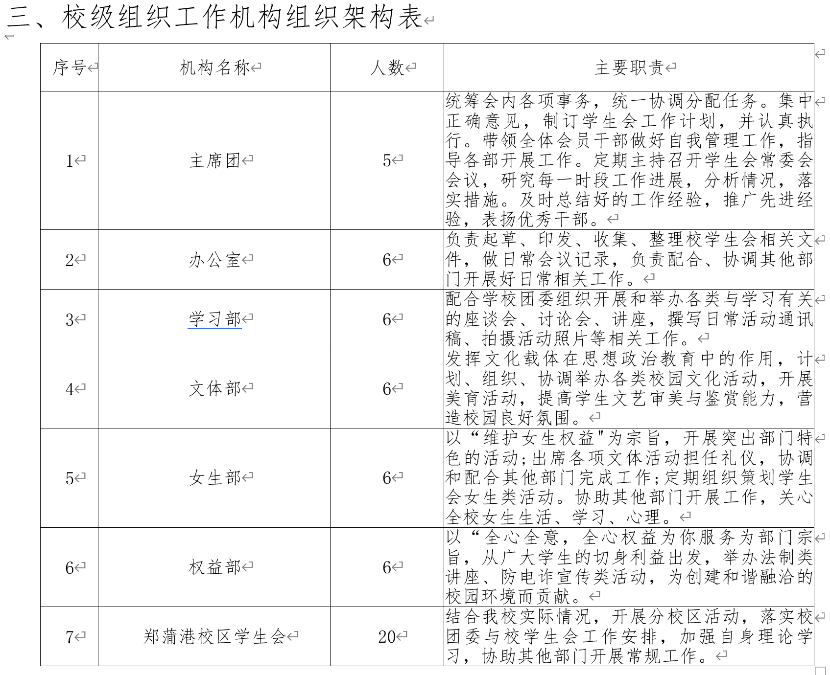 第十五条学生会下设∶办公室、文体部、学习部、权益部、女生部、郑蒲港校区学生会。根据工作需要可进行适当调整。