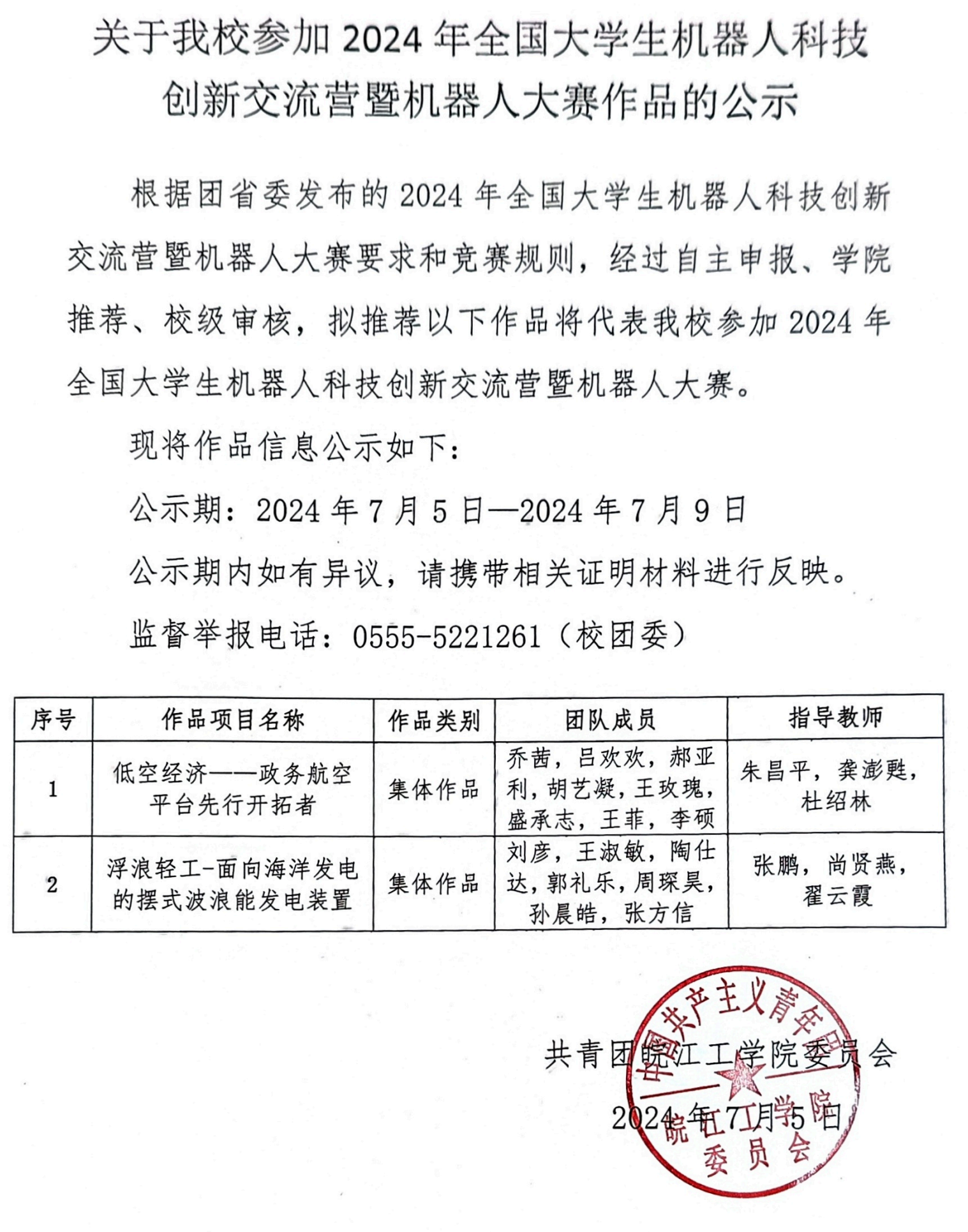 关于beat365官网参加2024年全国大学生机器人科技创新交流营暨机器人大赛作品的公示