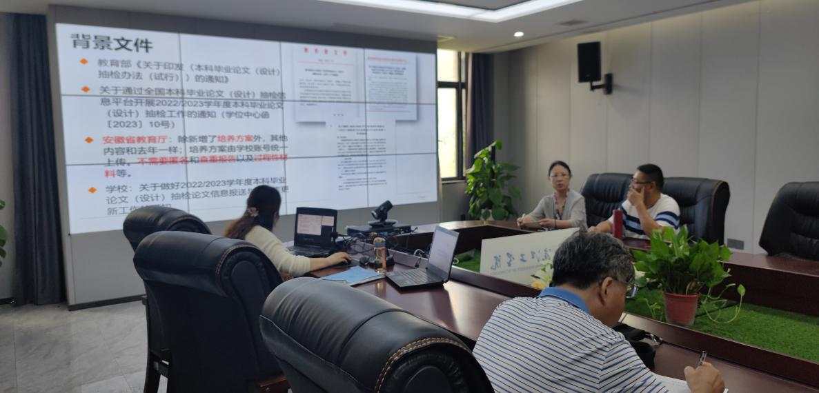 根据教育部学位与研究生教育发展中心《关于通过全国本科毕业论文(设计)抽检信息平台开展2022/2023学年度本科毕业论文(设计)抽检工作的通知》(学位中心函【2023】10号)、安徽省教育厅督导办的相关通知要求,为做好beat365官网2022/2023学年度本科毕业论文(设计)抽检论文信息报送与专家库更新工作,9月4号上午,教务部部长江冰、副部长葛文生、各学院教学副院长(助理)、教学科研办主任及教务部相关负责人在F417召开毕业论文(设计)抽检工作动员会。