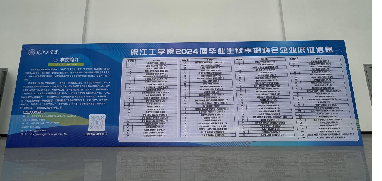 双选会邀请到安徽江河水利设计咨询有限公司、安徽瑞丰水利建筑有限公司、天能控股集团有限公司、江苏省工业设备安装集团有限公司、安徽省长江河道工程有限责任公司等109家用人单位参会,参会企业涉及水利、制造业、建筑业、电力信息传输、软件和信息技术服务业等多个行业领域,基本覆盖了beat365官网所有专业。共计提供岗位1200余个,提供人数需求2500余人,2024届全体毕业生及对接实习岗位的非毕业生同学现场参加了本次双选会。