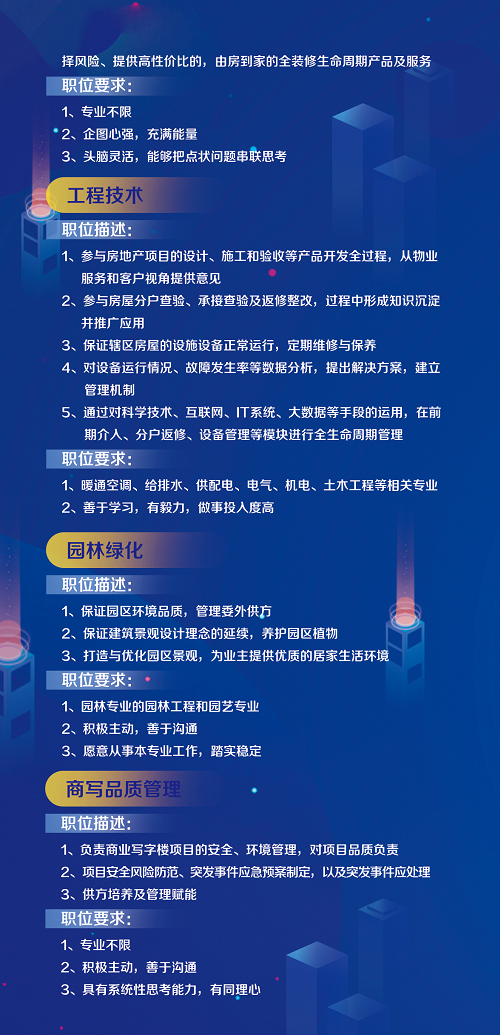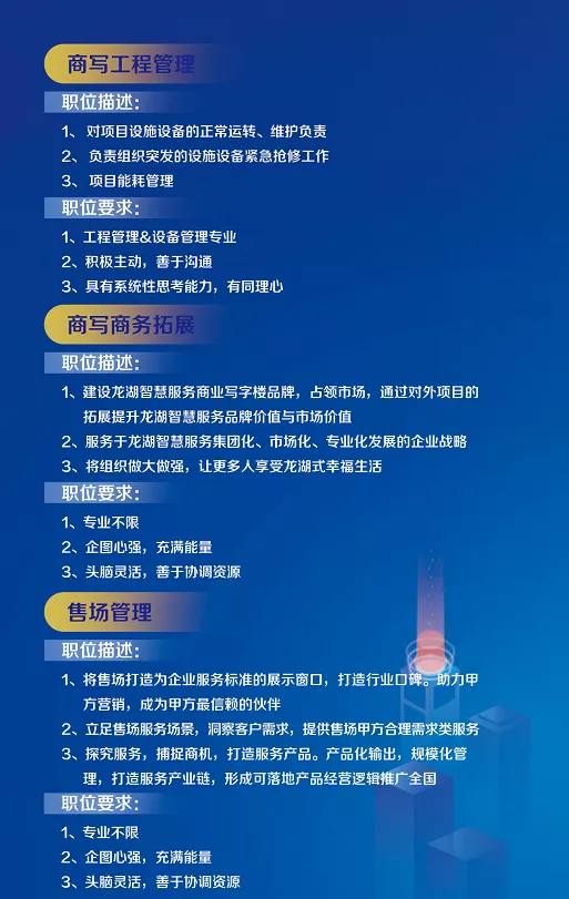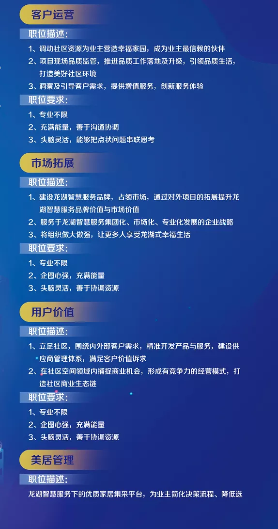 2021 年项目全新升级,升级后的点将计划涵盖了龙湖集团智慧服务、塘鹅美装修等业务,是面向未来选拔培养高素质的运营类、工程类人才而打造的校园招聘计划,旨在招聘具有生意头脑、客户导向、开放迭代、自驱进取的复合型项目管理精英。