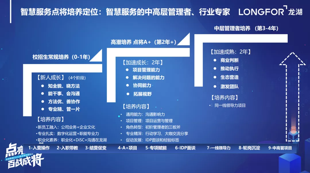 点将项目在龙湖智慧服务已经运营十八年,旨在寻找面向未来的管理人才和核心骨干,通过体系化培养、高潜人才A+项目培养、中层管理者梯队培养等方式培养了一批具备高综合素质的复合型管理人才,以支撑企业快速发展战略。