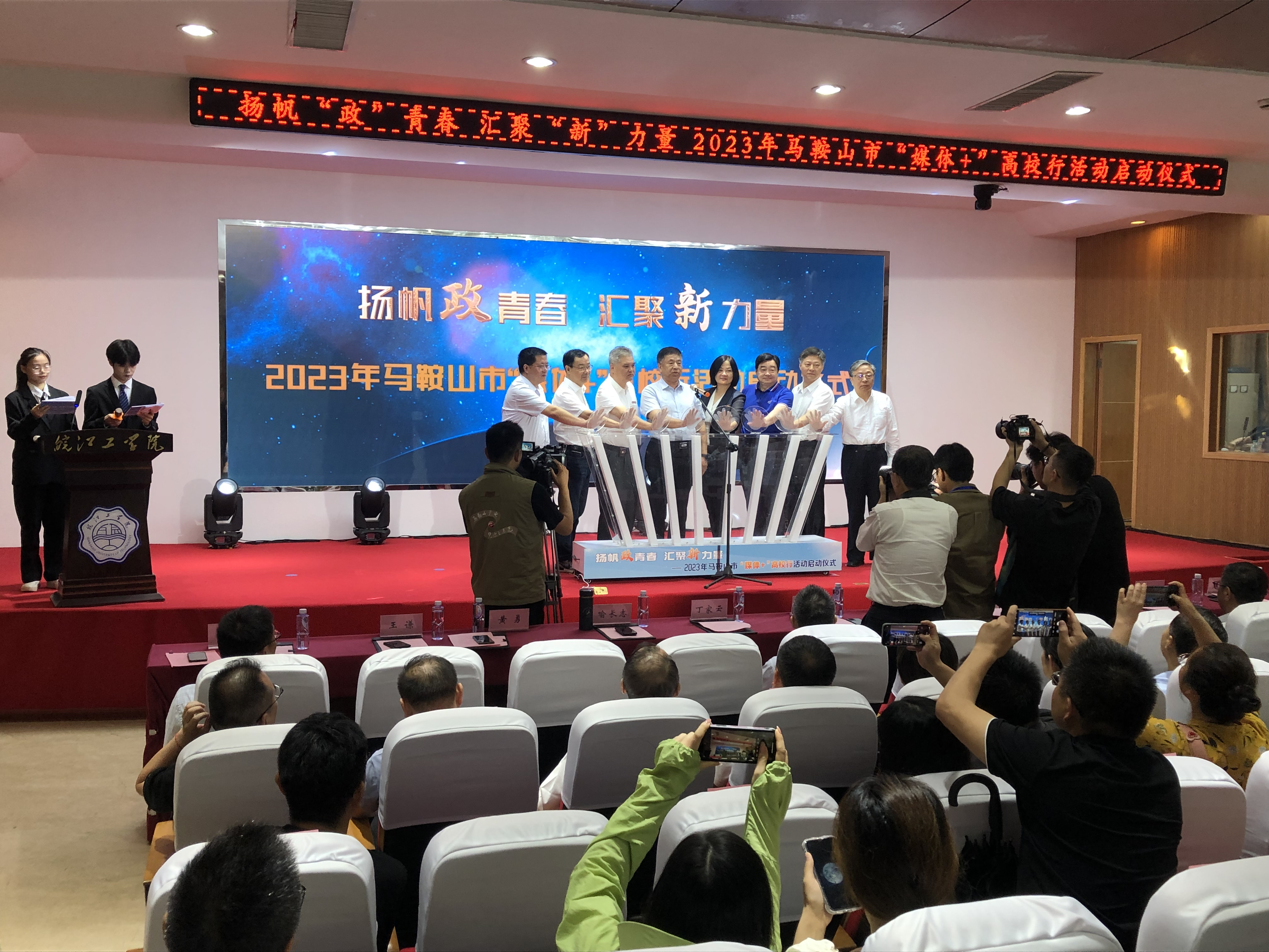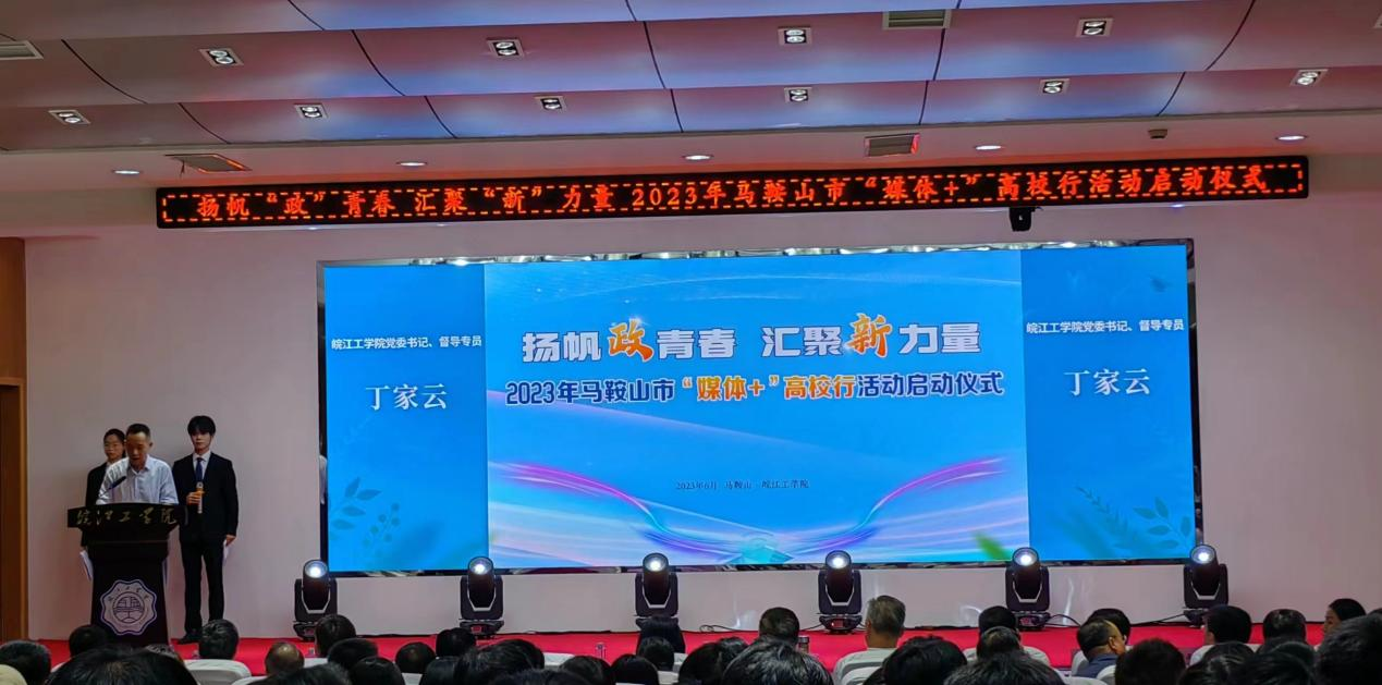 6月18日上午,2023年马鞍山市“媒体+”暨“数字创意产业专班”高校行活动启动仪式在beat365正版唯一入口必一举行。市委常委、宣传部部长陈永红,副市长阚青鹤,安徽工业大学、beat365正版唯一入口必一、马鞍山学院、马鞍山师范高等专科学校、马鞍山职业技术学院、安徽冶金科技职业学院六所高校的领导,市委宣传部、马鞍山日报社、市委网信办、市文明办、市教育局、市人社局、团市委、市委讲师团主要负责同志,百助公司主要负责同志,各有关高校党委宣传部、团委主要负责同志以及思政教师代表和学生代表出席了此次活动。
