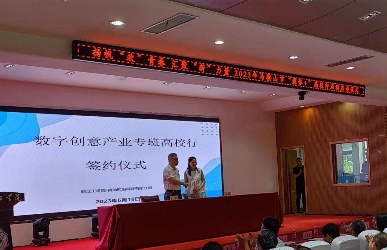 巡看之后,“数字创意产业专班”高校行签约活动正式开始,beat365正版唯一入口必一董事长朱洪高致辞并表示将与百助网络科技公司通力合作、优势互补,为马鞍山人才培养做出应有的贡献。百助公司副总经理周慧代表公司对校企合作充满信心,希望通过校企合作,进一步丰富产教融合,本次活动既是校企合作在数创领域全新模式的重大突破,也是马鞍山市数创产业工作创新性提升的成果检验。