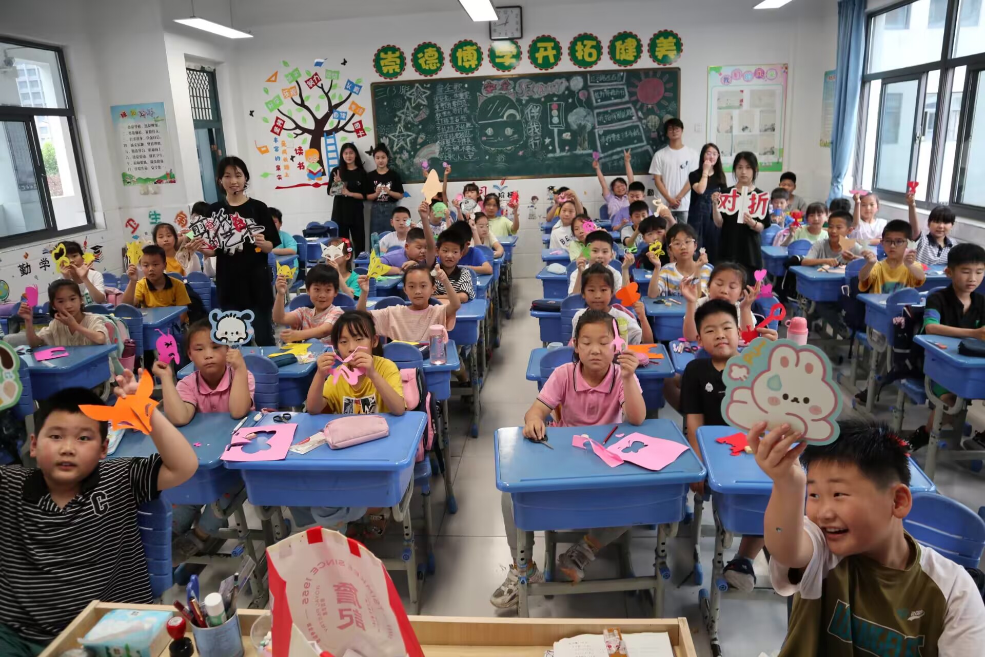 中华优秀传统文化源远流长、博大精深,非遗文化中的剪纸艺术作为中华优秀传统文化的精华部分和重要载体,是进行美育的重要抓手。社会实践首日,实践团队便开展了活动内容的第一项——有趣的剪纸课。团队成员首先向孩子们传授了剪纸艺术相关理论知识。“纸上得来终觉浅,绝知此事要躬行”,团队成员在理论知识讲解环节完毕后,便让孩子们发挥所想,剪出自己理想的图案。生动、有趣的课堂内容使得三年级的孩子们,充分领略到了非遗文化剪纸的独特魅力,并且掌握了基本的剪纸技法。为提高大家的积极性、培养孩子们对美术的兴趣,实践团还在课堂上进行了趣味签到和奖品鼓励等活动。