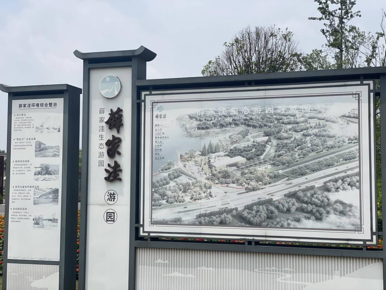 闲云谭影日悠悠,物换星移几个秋。涅槃重生的薛家洼生态园生态环境得到整体改善,景观面貌也得到大幅提升。污水横流,尘土飞扬的景象消失不见,取而代之的是碧波荡漾、芳草萋萋的美丽岸线。团队成员在薛家洼生态园入口处通过游园导览图深入了解薛家洼过去“散乱污”的场景以及近些年来的整治过程。