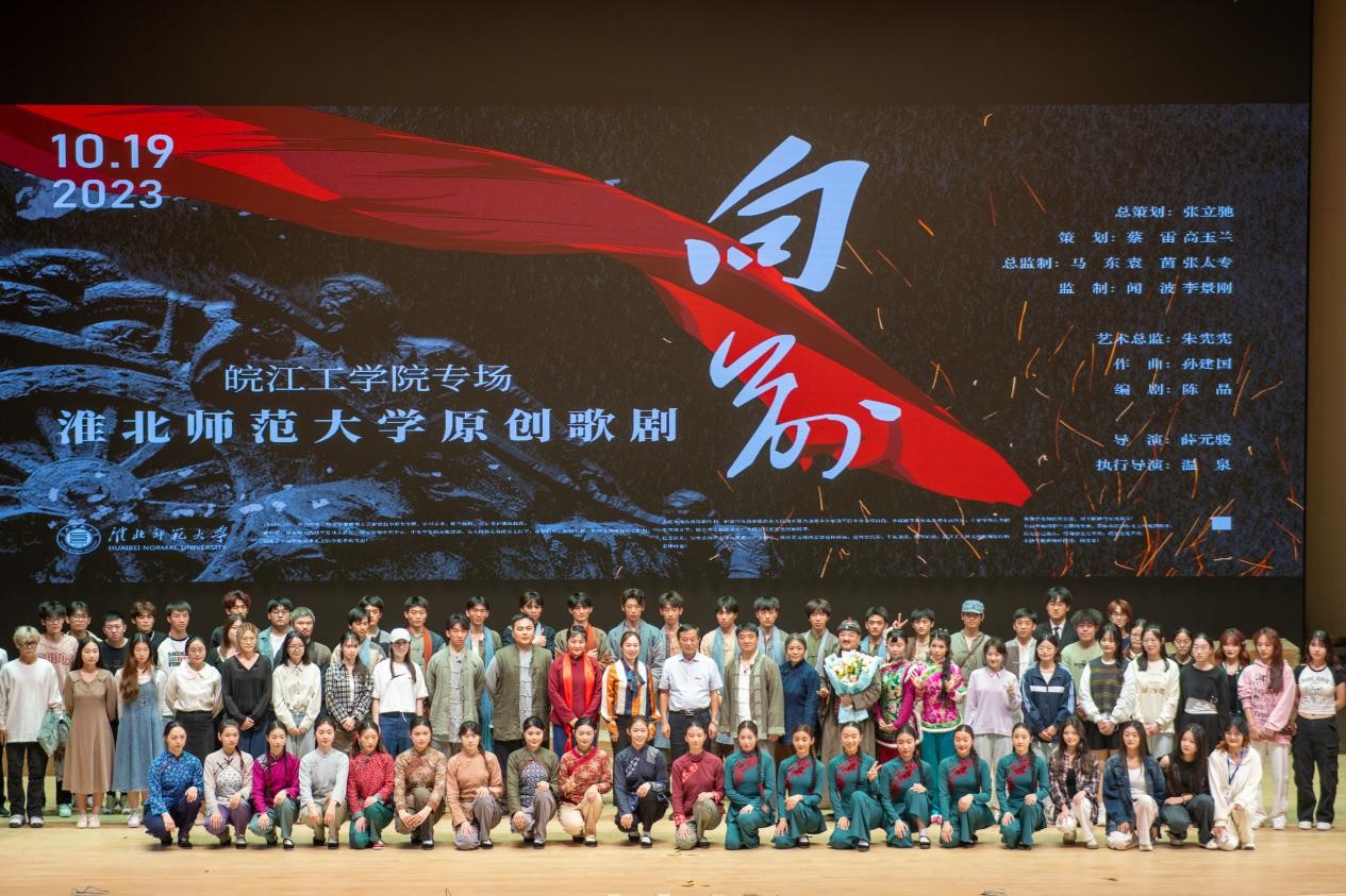 10月19日下午,2023年“高雅艺术进校园”淮北师范大学原创歌剧专场演出在beat365官网霍里山校区体育馆拉开帷幕。淮北师范大学音乐学院院长袁茵、党总支副书记李景刚、beat365正版唯一入口必一党委副书记孙良出席活动。800余名师生到场观看,现场气氛热烈。