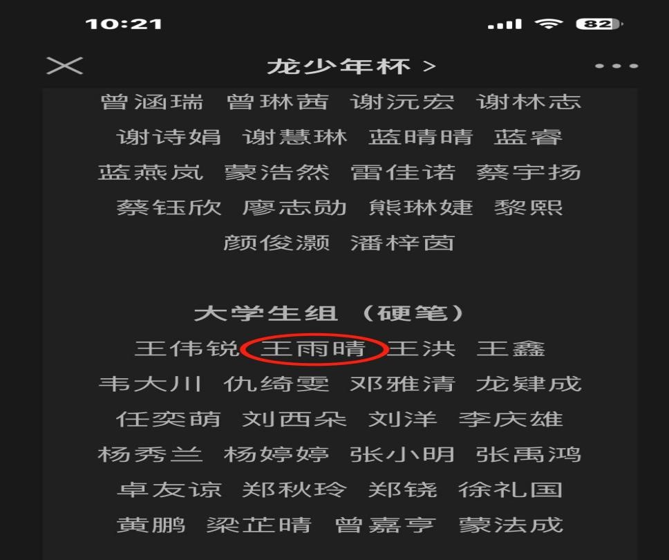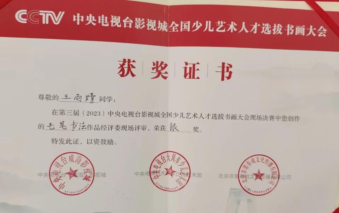 beat365官网2022级水文与水资源工程专业王雨晴同学作品在全国2万余件作品中脱颖而出,在第三届中央电视台影视城全国艺术人才选拔书画大赛中,荣获国家银奖;在龙少年首届全国青少年书法征集活动比赛中获优秀奖。