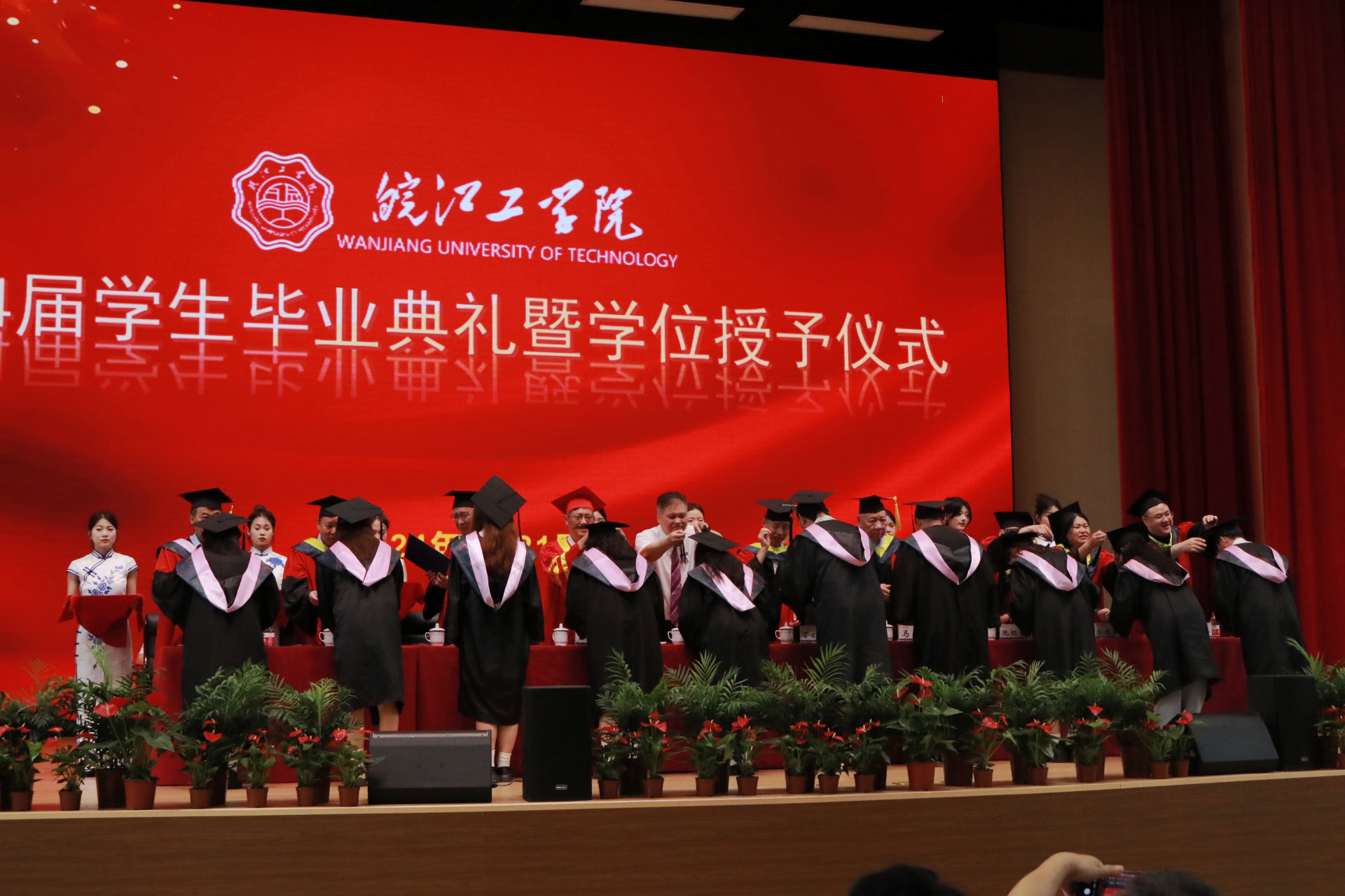 毕业典礼在毕业视频《记忆留“夏”,皖工有你》及斗志昂扬的国歌中毕业典礼正式拉开帷幕。