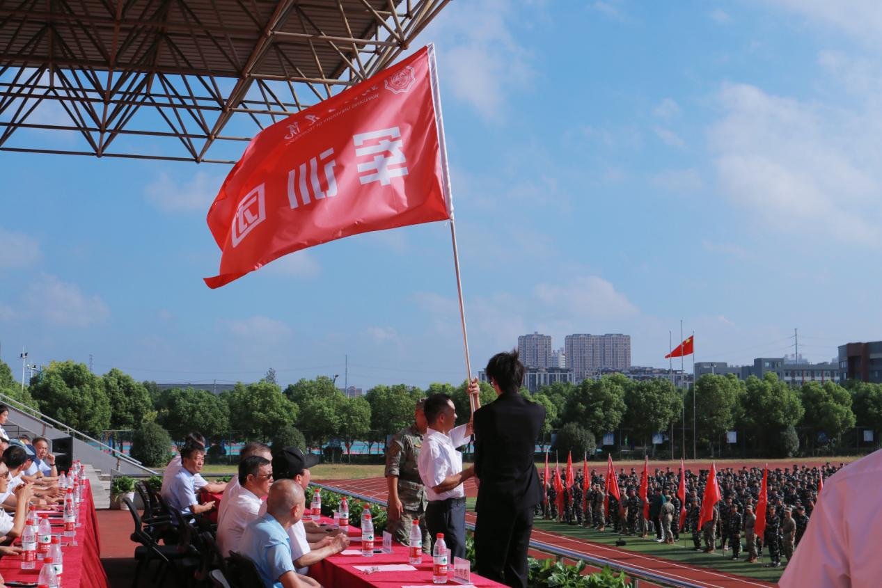 在军训动员阶段,侯进元宣读军训团成员名单,丁家云向军训部队授旗。迎风招展的红旗下,2024级新生开学典礼暨军训动员大会圆满结束。