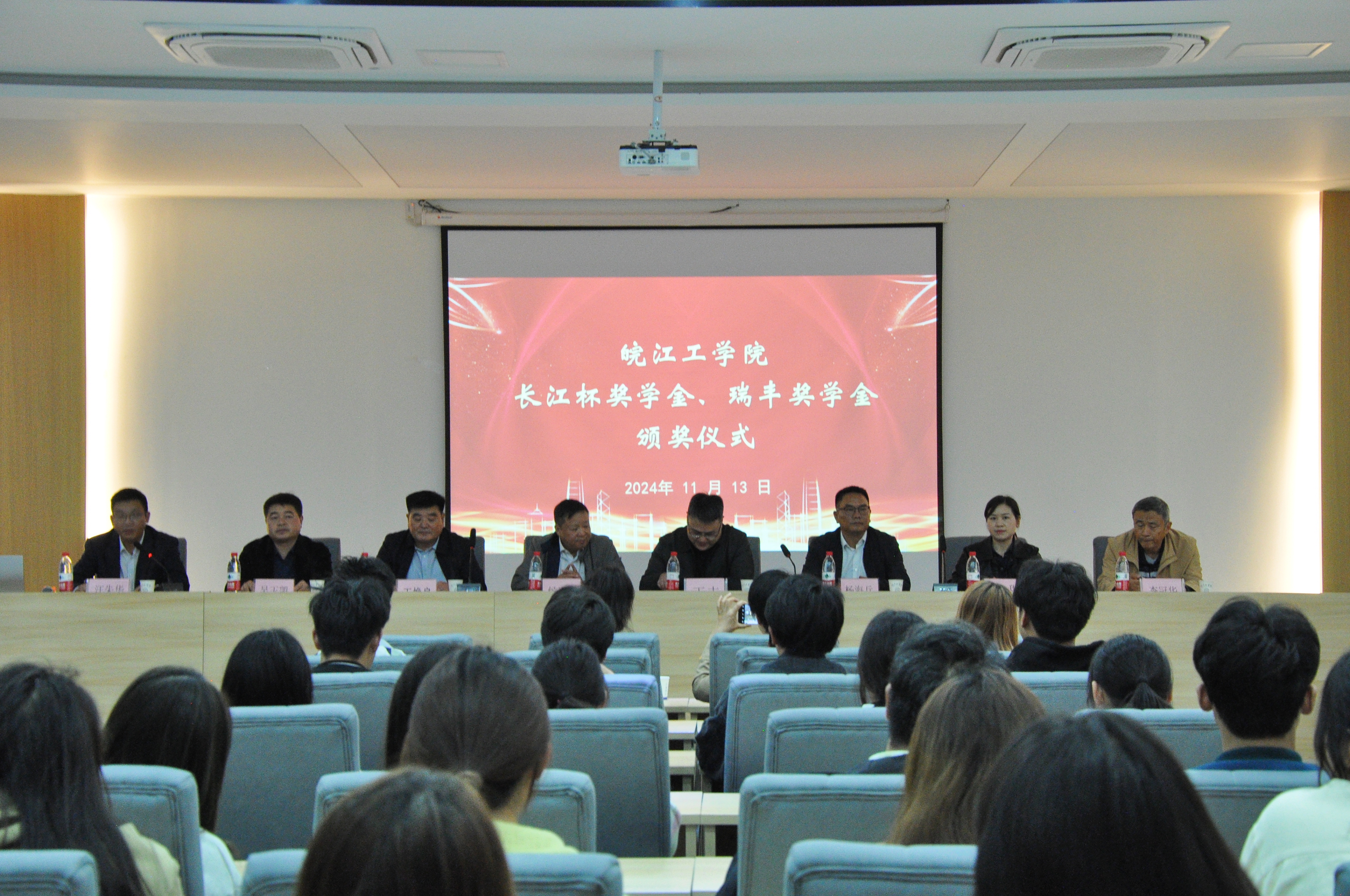 11月13日下午,beat365官网在水木楼楼西301会议室隆重举行了2024-2025学年“长江杯奖学金”和“瑞丰奖学金”颁奖典礼。安徽省长江河道工程有限责任公司董事长杨海兵、人力资源部部长宋小甜和安徽瑞丰工程科技集团有限公司董事长王焕良、副总经理吴玉凯、财务总监孙鲜明,beat365官网副校长侯进元、副校长王志,水利工程学院党总支书记李冠华,学工部常务副部长汪朱华出席此次仪式。颁奖仪式由汪朱华主持,“长江杯奖学金”和“瑞丰奖学金”分别由两家企业出资设立。