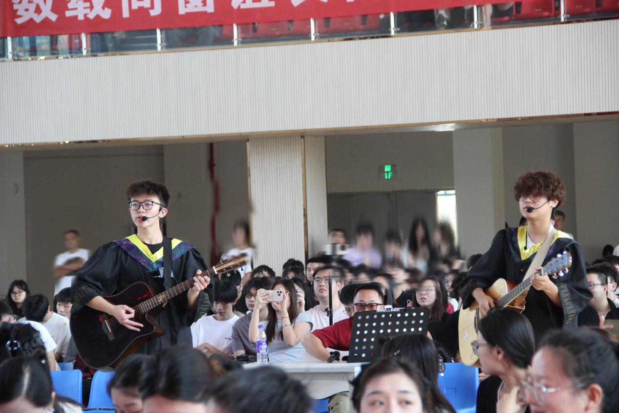 毕业生们身着学士服,以吉他弹唱诉说校园情长,歌曲《启程》的旋律,与高高扬起学位帽的剪影交织。这是独属于2025届毕业生的浪漫告别,用音乐串起四年青春碎片,在“青春不散场”的旋律里,把校园记忆唱成永远的珍藏,让这场毕业礼,既有庄重的仪式感,更有青春的温度与回响。
