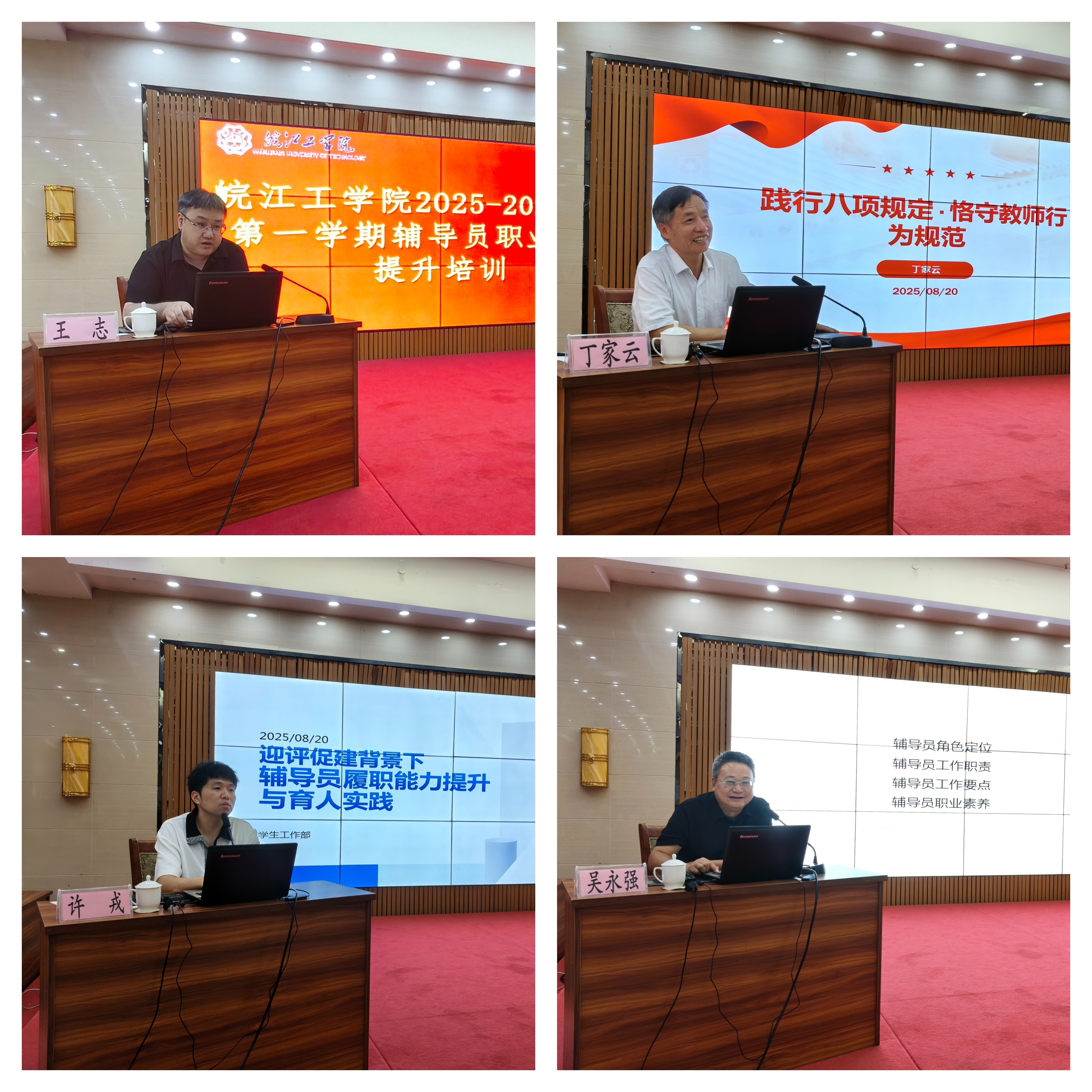 在专题授课环节,省督导专员、校党委书记丁家云围绕“践行八项规定・恪守教师行为规范”,深入解读中央八项规定精神与师德师风建设的内在联系,结合典型案例阐释教师廉洁自律、务实作风的重要性;河海大学常州校区管委会主任吴永强从辅导员角色定位、工作职责、工作要点等方面展开,分享辅导员工作实务经验;学工部副部长许戎聚焦迎评促建背景,系统讲解辅导员履职能力提升路径与育人实践要点,明确本科教学合格评估中的整改任务与协同方法。