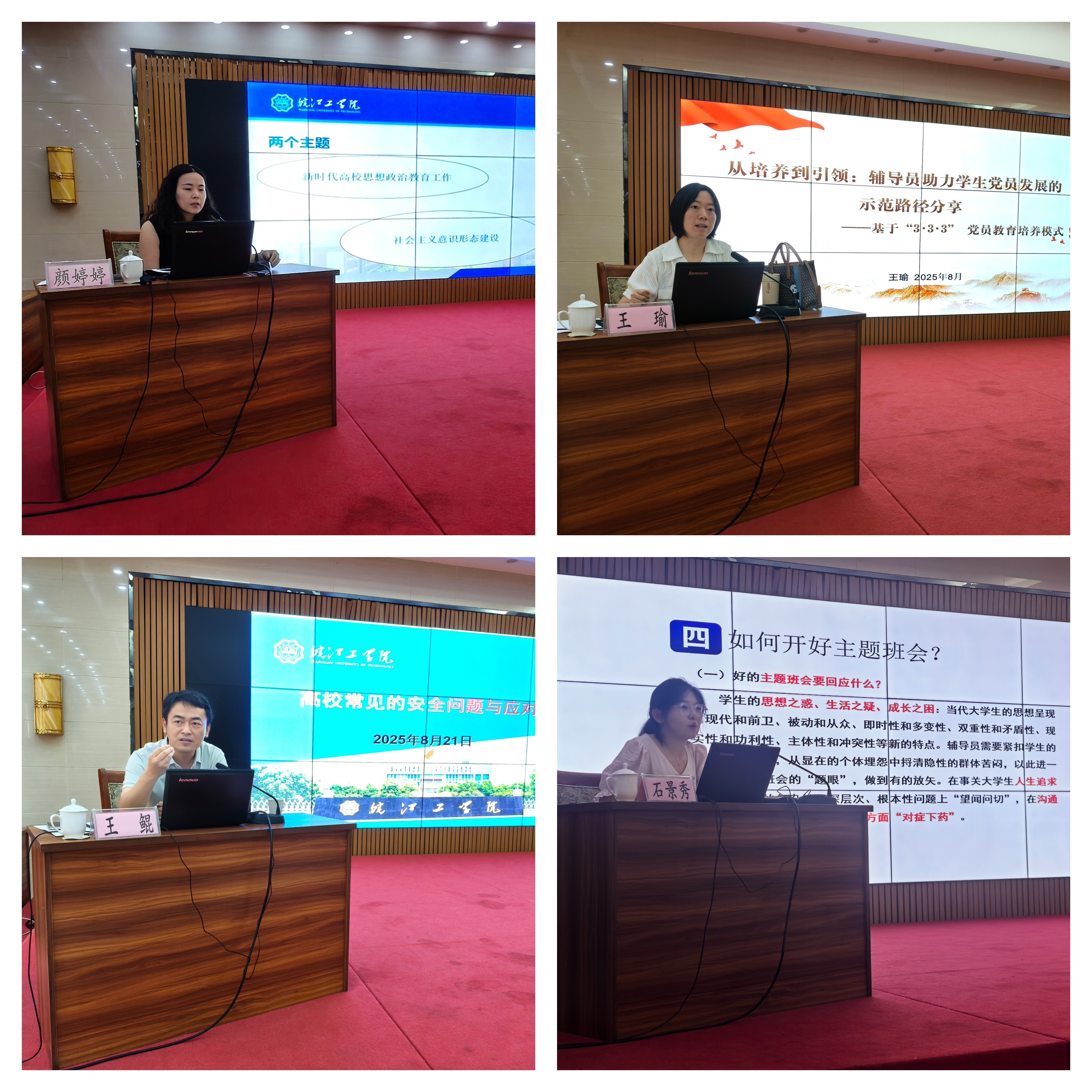 土木工程学院党总支书记王瑜以“3・3・3” 党员教育培养模式为例,分享辅导员助力学生党员发展的示范路径;机械工程学院党总支副书记颜婷婷结合高校意识形态工作新形势,围绕社会主义意识形态建设、宗教渗透防范等内容进行专题培训;院务部副部长王鲲聚焦高校学生安全稳定工作,解析政治安全、消防安全、反诈安全等常见问题的应对策略;水利工程学院辅导员石景秀结合新生工作实际,从班级建设、班干部培养、主题班会设计等方面提供实操指导;教务部学籍管理科副科长陈滢则针对学生学籍管理政策与流程进行详细解读,为辅导员日常事务管理提供专业支撑。