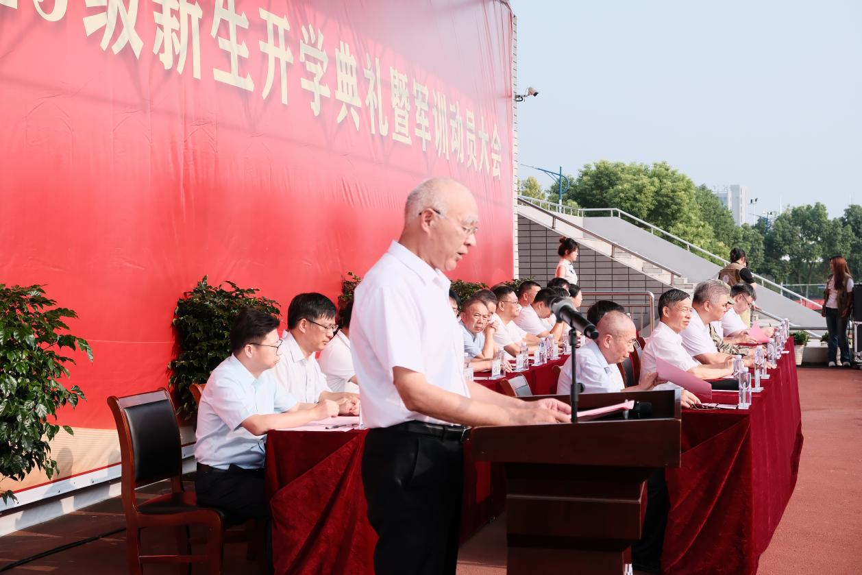 在军训动员阶段,侯进元宣读军训团成员名单,丁家云向军训部队授旗。迎风招展的红旗下,2025级新生开学典礼暨军训动员大会圆满结束。