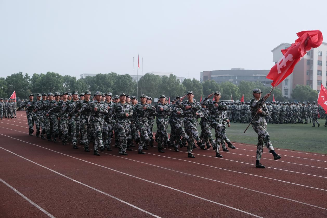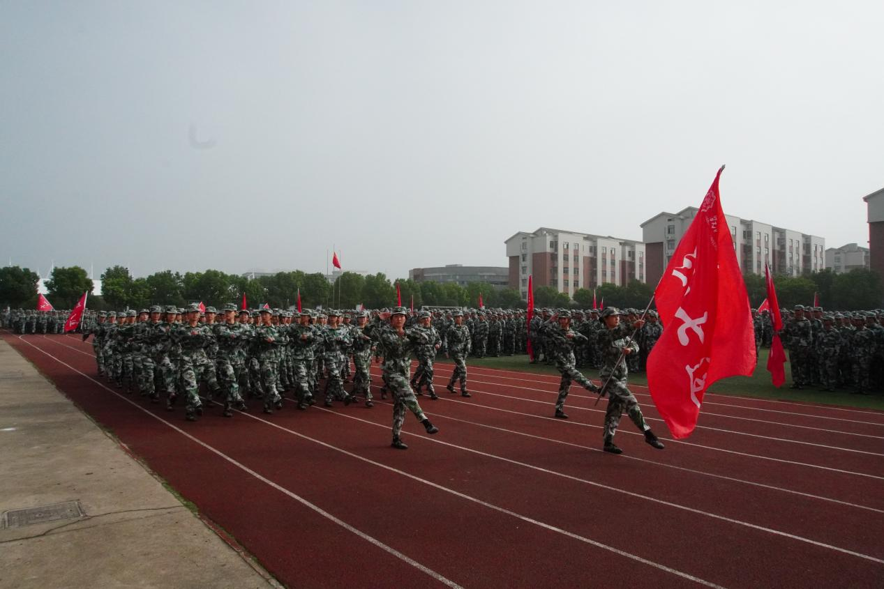 随着嘹亮的《国歌》响起,五星红旗冉冉升起,全体人员起立行注目礼。升旗仪式后,42个新生方阵依次迈着铿锵步伐通过主席台接受检阅。身着迷彩服的新生们身姿挺拔、口号嘹亮,正步踢踏声整齐划一,充分展现出21天军训锤炼的纪律意识与精神风貌。