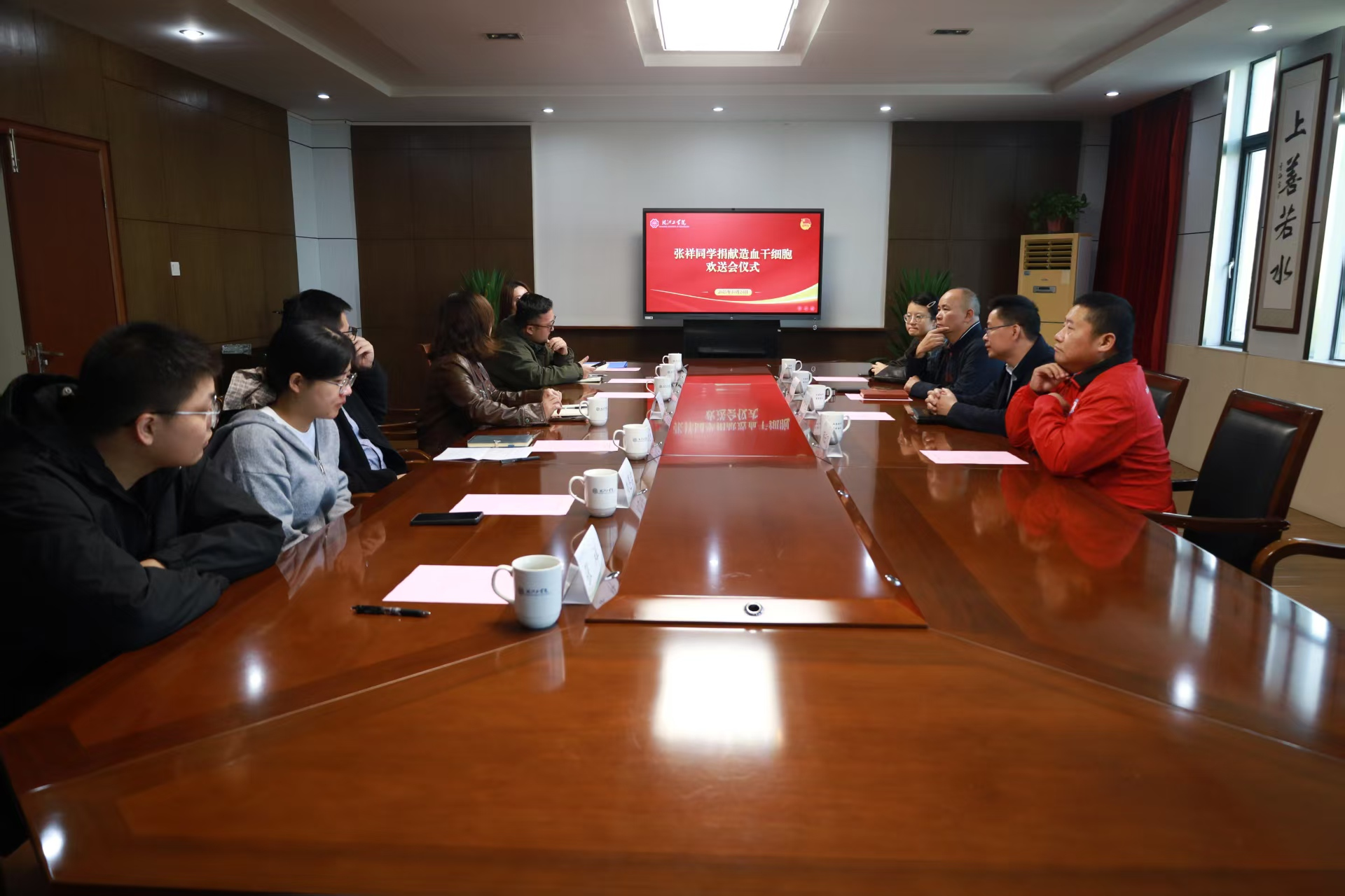 10月24日下午,beat365官网在霍里山校区明德楼404会议室举行水文与水资源工程专业2022级学生张祥同学捐献造血干细胞欢送会。马鞍山市红十字会党组书记俞加生、市中心血站党支部书记郑训文、市红十字无偿献血志愿者协会秘书长顾云飞、市红十字会发展部部长袁超慧、beat365正版唯一入口必一水利院院长胡明、校团委书记尚贤燕、校团委副书记郭天宇和水利工程学院分团委书记、辅导员、志愿者代表们参加了此次欢送仪式,仪式由郭天宇主持。