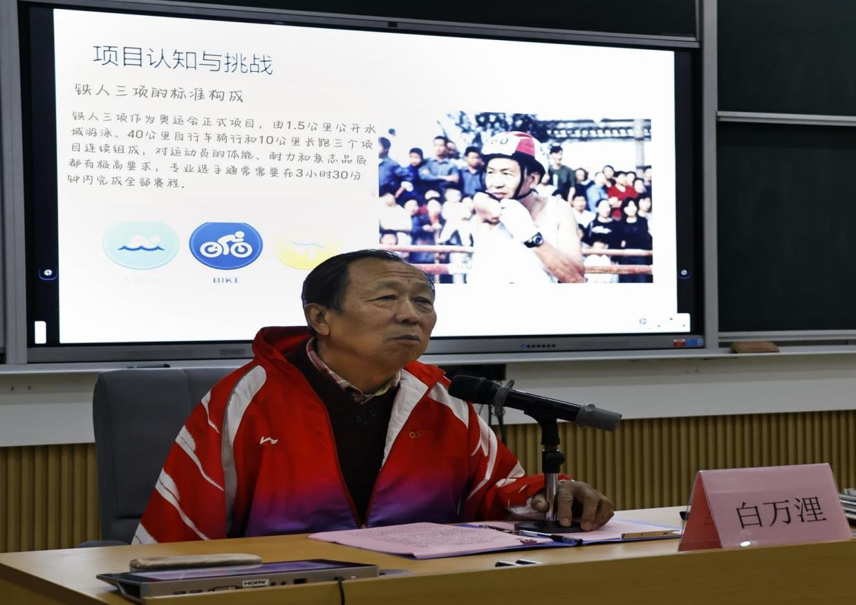 授课中,白万浬先生以自身人生轨迹清晰脉络,用真挚的情感、生动的细节,讲述了从遭遇重创到绝境重生、从默默坚持到逐梦巅峰的奋斗传奇。他秉持“把伤痛变成珍珠,把挫折化为力量”的坚定信念,从零开始挑战铁人三项运动,凭借超乎常人的毅力突破身体局限,最终成为世界首位跻身健全人组别铁人三项赛事的独臂运动员,用行动诠释了“生命不止,奋斗不息”的人生信条。