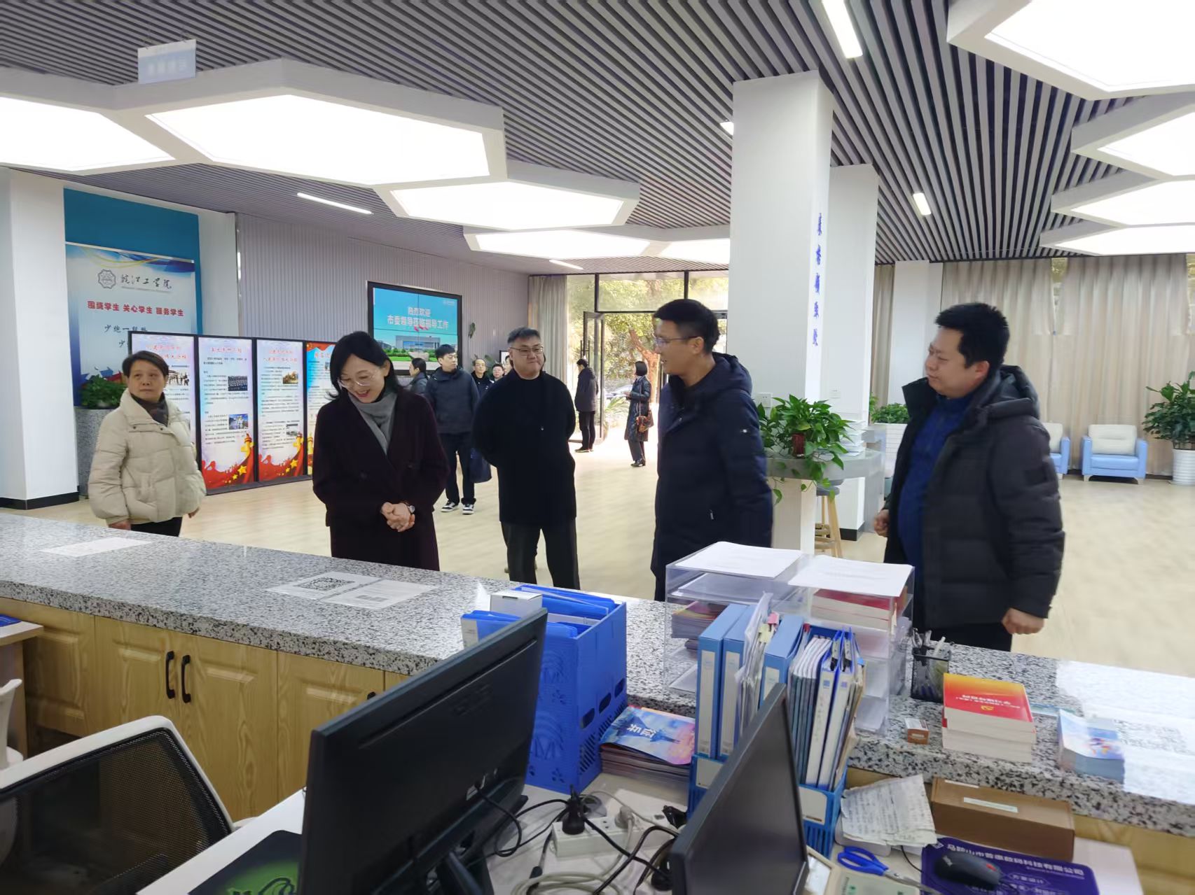 随后,调研组实地考察大学生一站式服务中心。该中心以 “方便学生办事、解决学生困难、维护学生权益、帮助学生成才” 为核心目标,学工部常务副部长汪朱华、副部长许戎围绕中心具体工作开展情况作详细汇报。中心业务涵盖学籍管理、就业指导、奖助学金申请、入伍咨询、证件办理等多项学生高频需求事项;服务大厅划分接待区、办公区、表格填写区、信息公布区、休闲等待区及校园卡自助服务区,开设12个服务窗口,切实为学生提供便捷高效的一站式服务,充分彰显学校以生为本的服务理念。