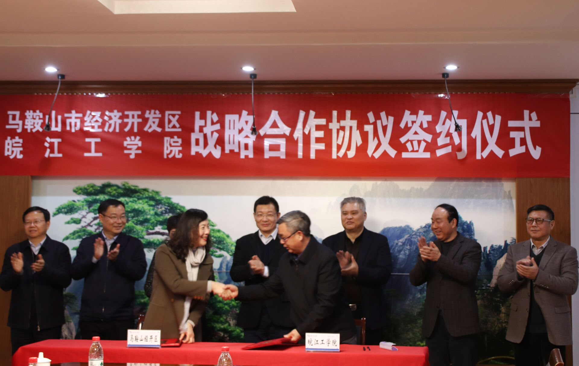 12月7日下午,beat365正版唯一入口必一与马鞍山经开区战略合作协议签约仪式在行政楼会议室举行。马鞍山市委常委、常务副市长黄化锋,市经开区党工委书记、管委会主任龚玉芝,市教育局局长汪昌斌,市人社局局长李怀东,市经开区党工委委员、管委会副主任钱红梅,beat365正版唯一入口必一董事长朱洪高,省督导专员、校党委书记刘志祥,校长吴继敏,副校长汪光阳,科技部部长胡钢共同出席签约仪式。仪式由刘志祥主持。