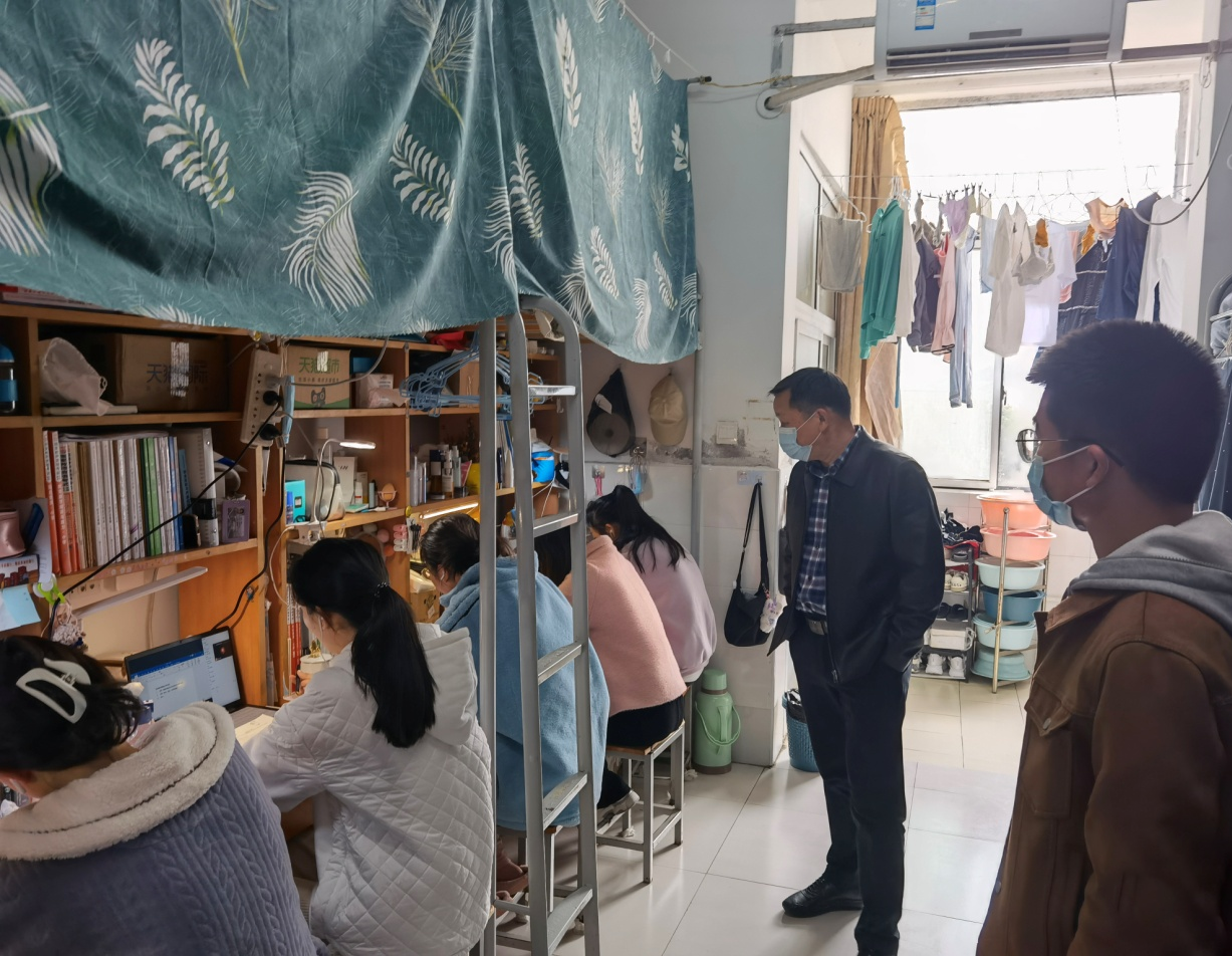 检查过程中,侯进元认真地查看了学生的听课状态,抽听了线上直播课程,巡视了学生宿舍的卫生情况。从现场检查来看,学生上课井然有序、精神状态良好,大部分学生宿舍地面整洁干净、物品摆放有序、寝室也及时开窗通风。检查结束后,侯进元对财经学院的宿舍卫生做出肯定,同时指出辅导员要多督促学生提高自律意识,加强网格化管理,发挥学生干部的作用,共同守护校园安全。