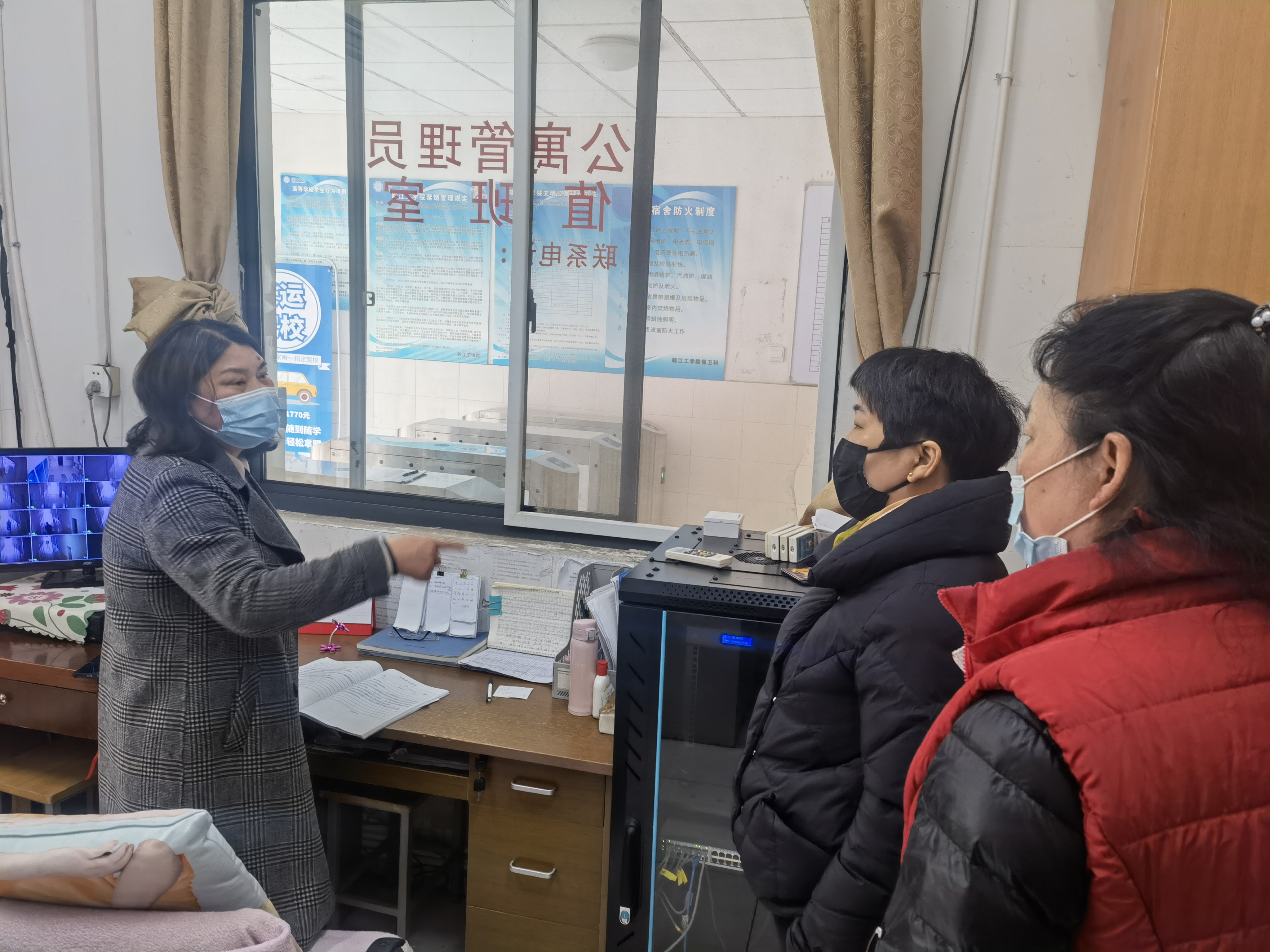 朱建芬一行依次检查了各个宿舍楼的内外部公共区域卫生状况,检查了每位宿舍管理员的工作台账和相关工作记录,并就如何加强疫情期间宿舍卫生安全管理工作进行现场指导。