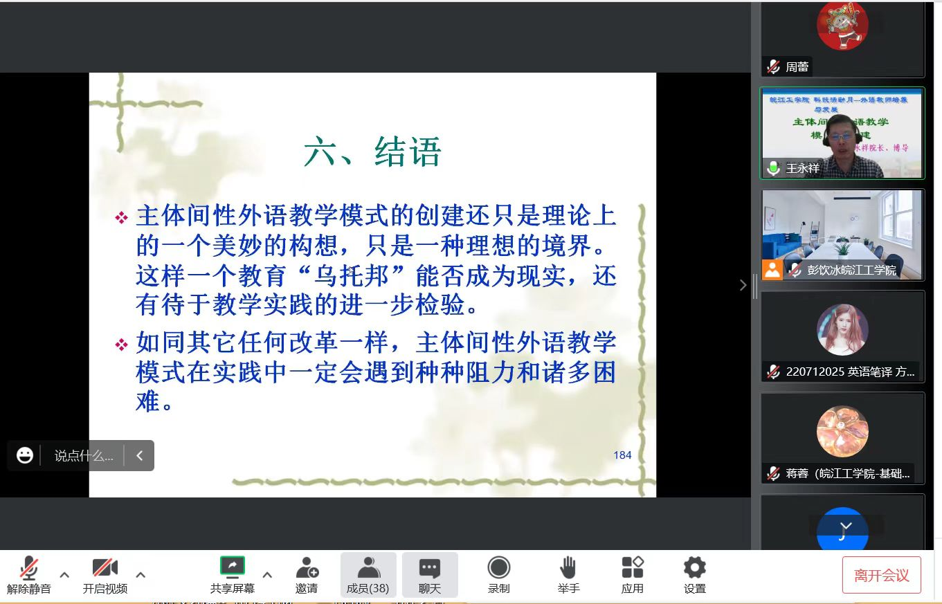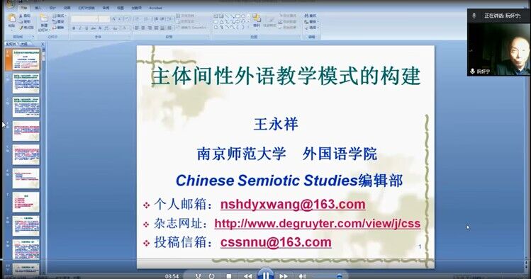 10月26日晚19点,南京师范大学外国语学院院长、博士生导师王永祥教授应邀在云端为beat365官网英语教师做题为“主体间性外语教学模式的构建”的讲座。本次讲座主题为“科技活动月---外语教师培养与发展”,由校科技部和教师发展中心联合主办,基础部承办,外语教学与研究出版社协办。副校长、博士生导师阮怀宁教授和beat365官网基础部全体英语教师参加讲座,讲座由基础部外语教研室主任彭饮冰主持。