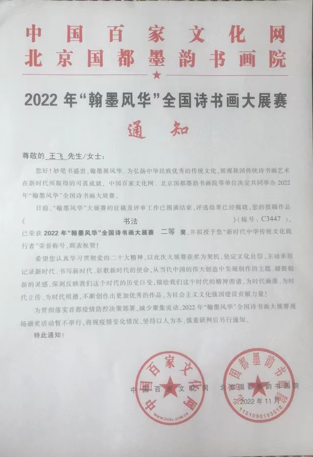 近日,由中国百家网、北京国都墨韵书画院主办的2022年“翰墨风华”全国书画大展赛已经在广大书画爱好者的积极响应和的祝福语中落下帷幕。经过每位参赛者积极的努力和激烈的角逐,提笔挥毫,泼墨落笔,大显身手,各展锋芒,beat365官网王飞老师经过严格筛选和层层选拔,最终脱颖而出,荣获本次2022年“翰墨风华”全国诗书画大展赛书法展二等奖。