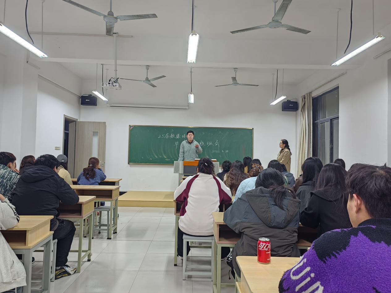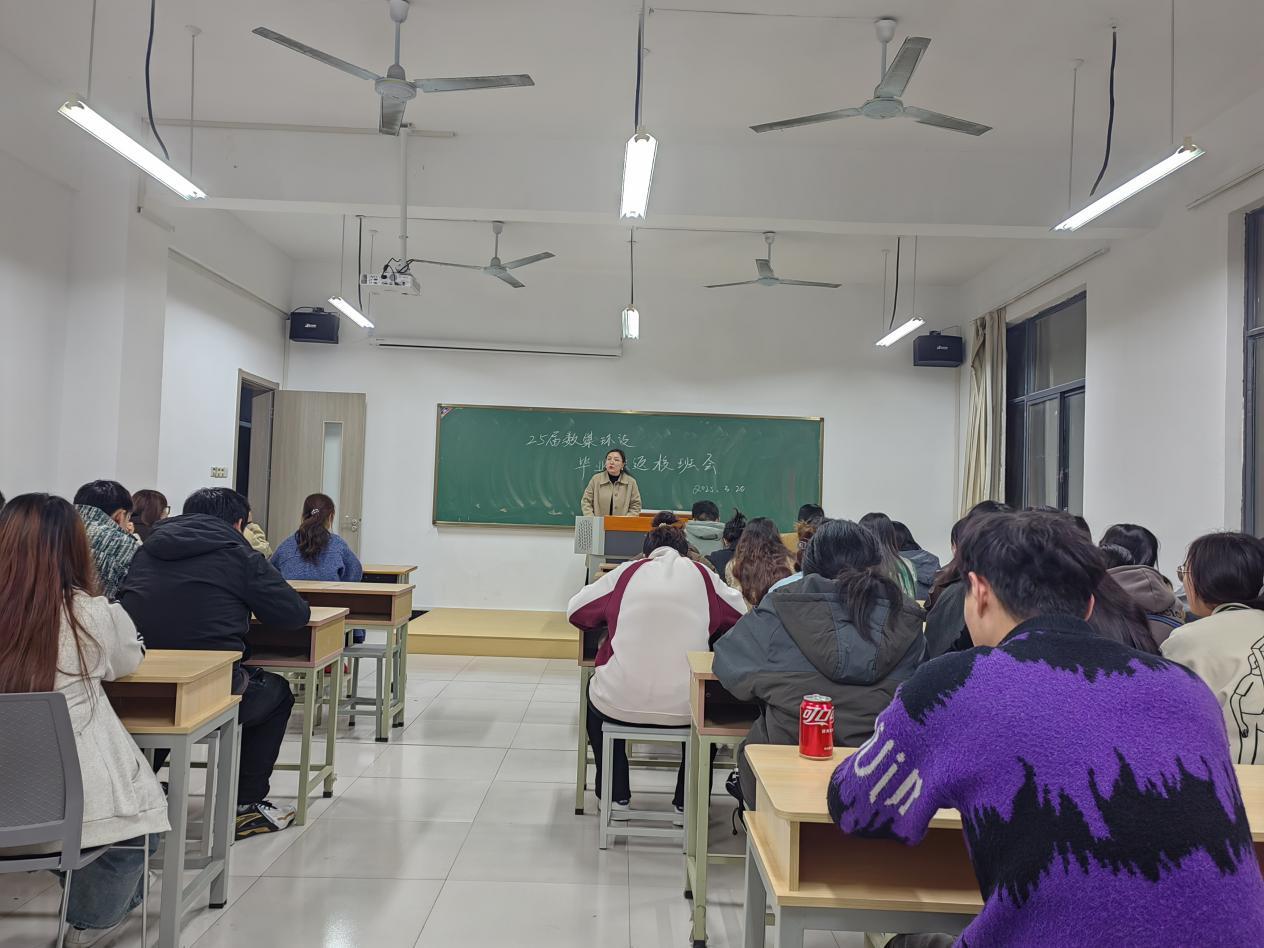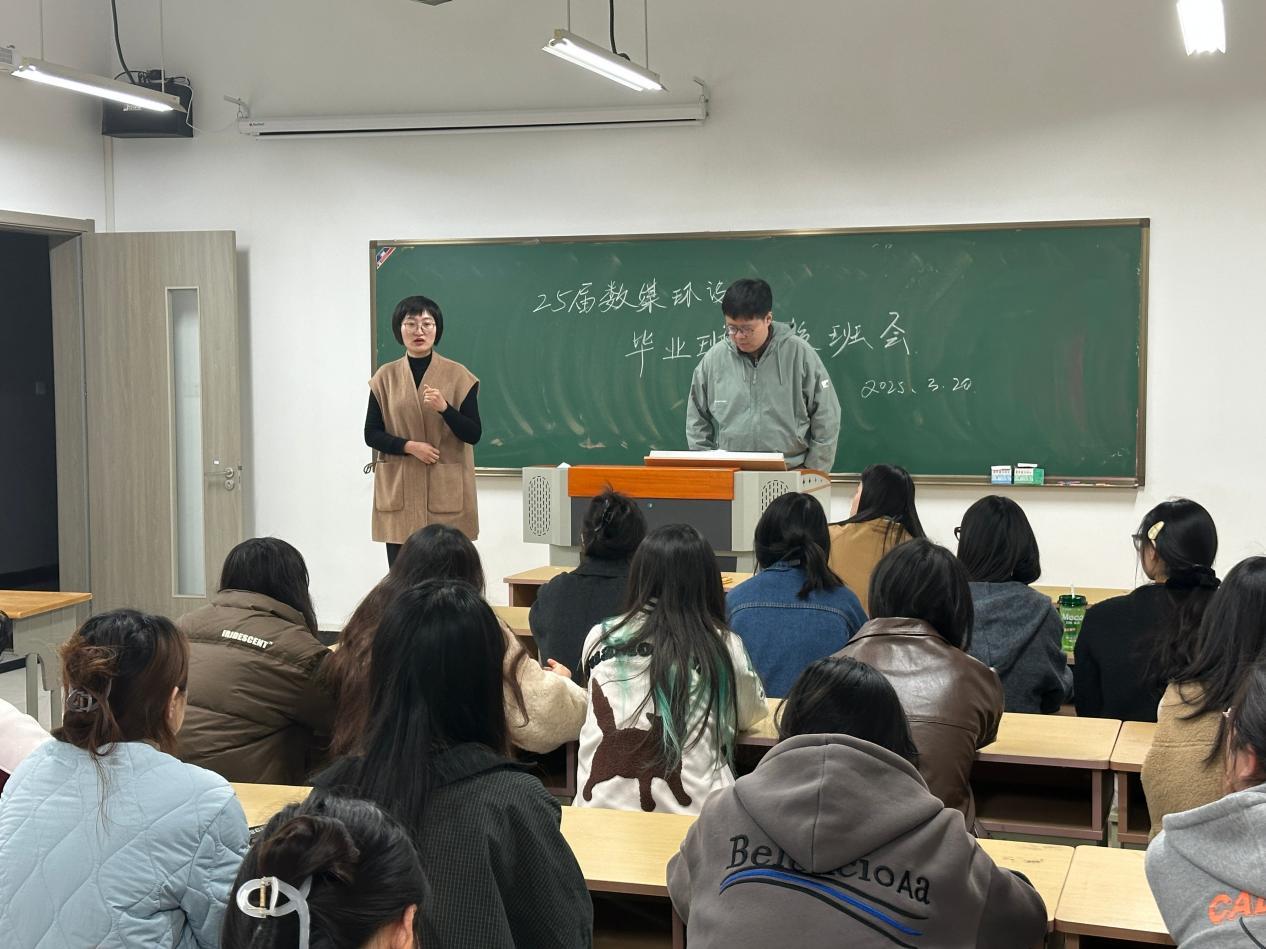 3月20日晚艺术设计学院在洪雅楼303教室举行“2025届毕业生返校主题教育班会暨就业推进会”。学院党总支副书记程楠楠、数媒教研室主任阎磊、副主任代明凤,毕业班辅导员涂燕茹及全体2025届毕业生参加会议。会议聚焦学业规划、毕业审查、就业指导三大核心任务,为毕业生顺利走好“最后一公里”保驾护航。