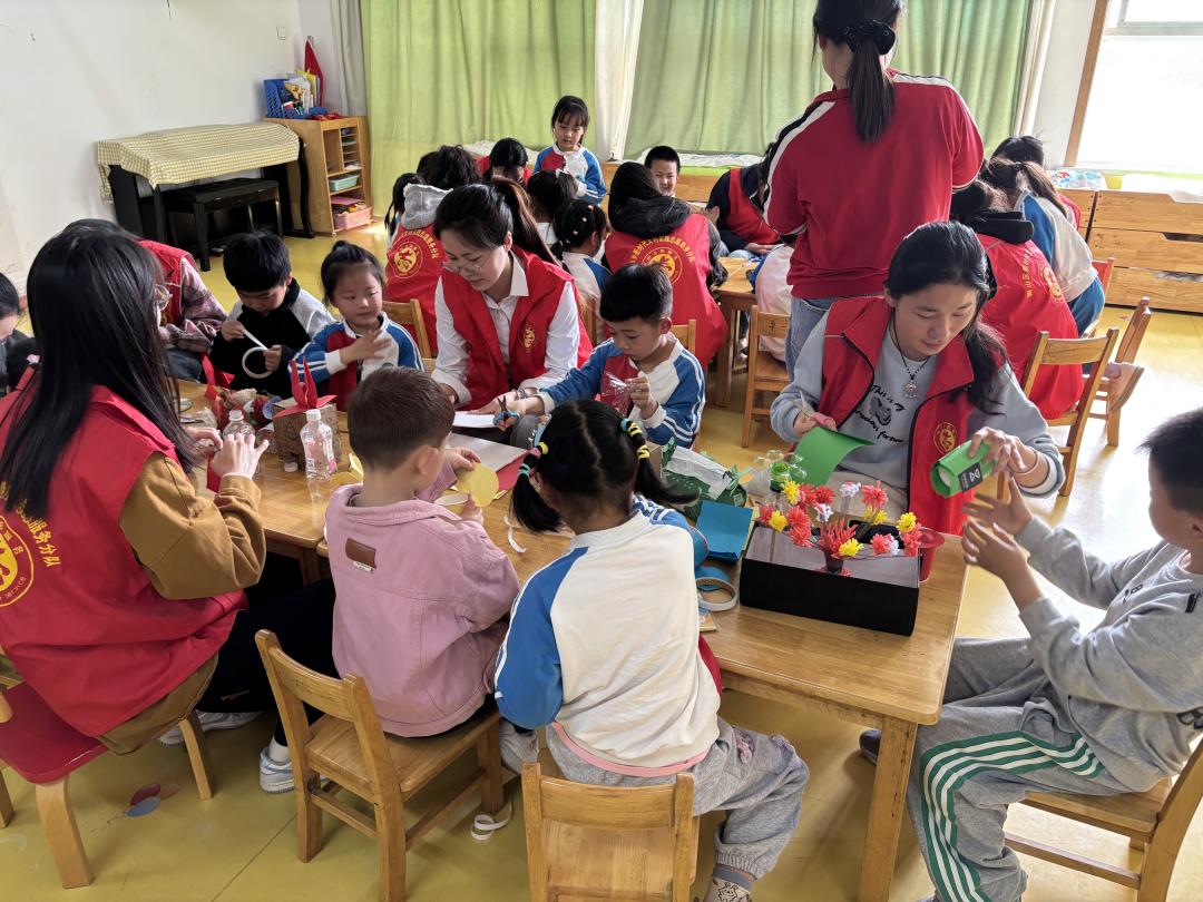 随后,志愿者们拿出提前收集的废旧塑料瓶、纸盒等材料,带领孩子们动手制作环保手工艺品。在“大手”和“小手”的协作下,塑料瓶被剪裁、装饰,逐渐变成五彩斑斓的花盆和笔筒;纸盒经过折叠粘贴,化身为收纳盒或小汽车,学生志愿者们用年轻人的创意点燃了孩子们对环保的兴趣。