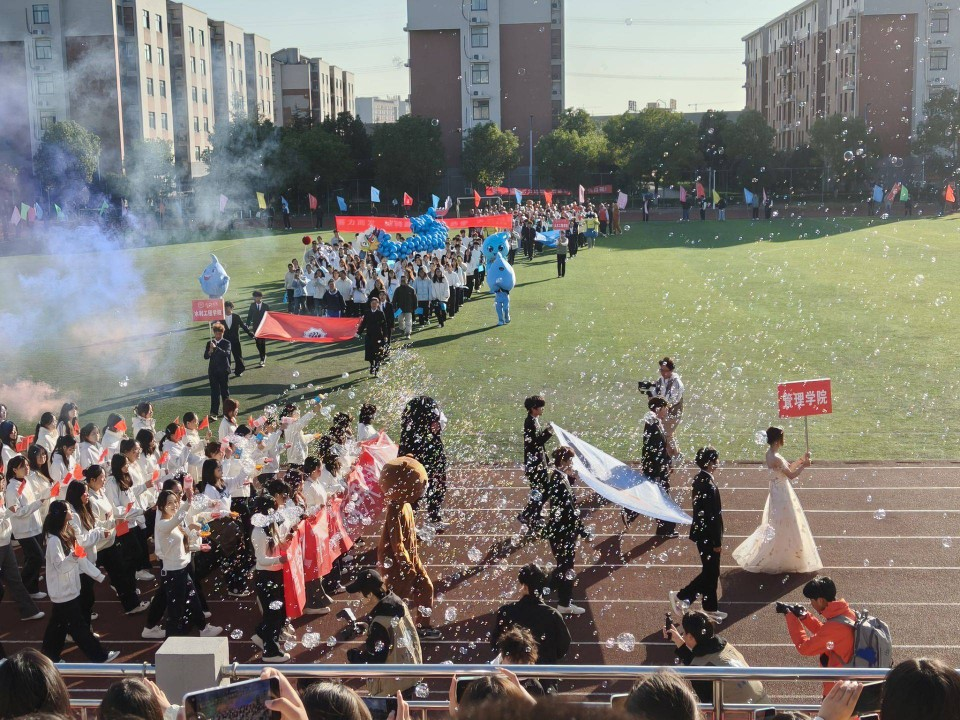 开幕式伊始,校长发表开幕词,强调运动会是培养学生团结协作、顽强拼搏精神的重要载体。全体裁判员宣誓公正执裁后,各方阵依次进场。在庄严的校旗方阵、五彩斑斓的彩旗队入场预热后,各学院代表队登场,瞬间将现场气氛推向小高潮。