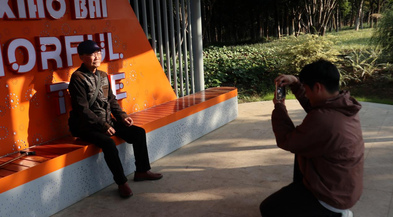 抵达南湖体育公园后,同学们迅速投入志愿服务。他们主动与园内休憩、锻炼的老年人亲切交流,送上节日祝福,并邀请他们参与拍摄。一位刚退休、正享受闲暇时光的老人欣然应邀,在同学们的引导下,他精神矍铄地面对镜头,一张充满活力的肖像被成功捕捉。手捧即刻生成的照片,老人脸上绽放出欣喜的笑容:“我好久没拍过这么快就能拿到的照片了,谢谢你小伙子!”