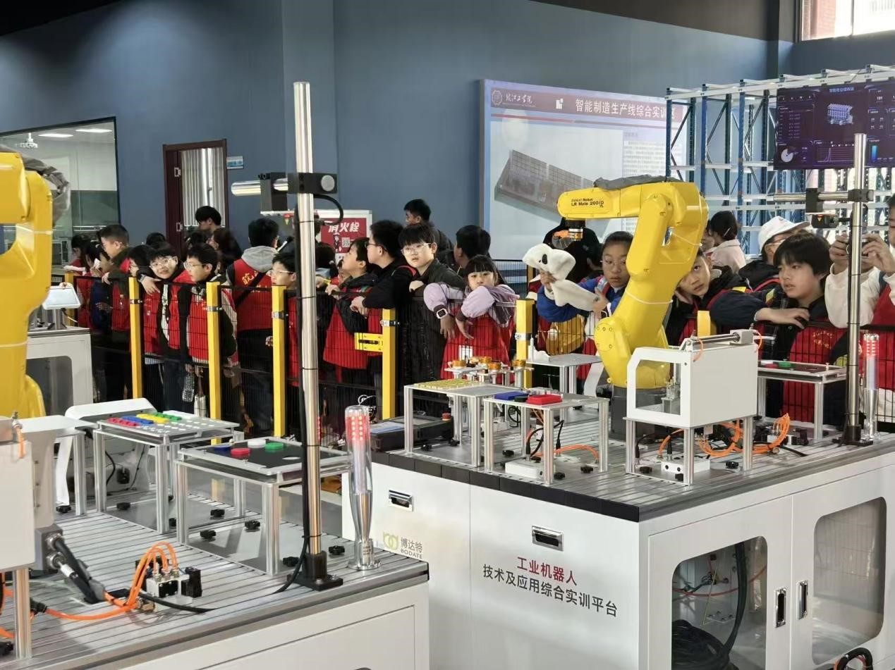 活动过程中,实训中心老师引导研学团参观五大核心实训区域。自动化教学生产线前,机械臂精准抓取、传送带有序输送的场景引发孩子们阵阵追问;智能制造生产线综合实训区的“从零件到成品”全流程,让大家直观理解工业生产逻辑;工业机器人灵活完成模拟任务,赢得现场惊叹。