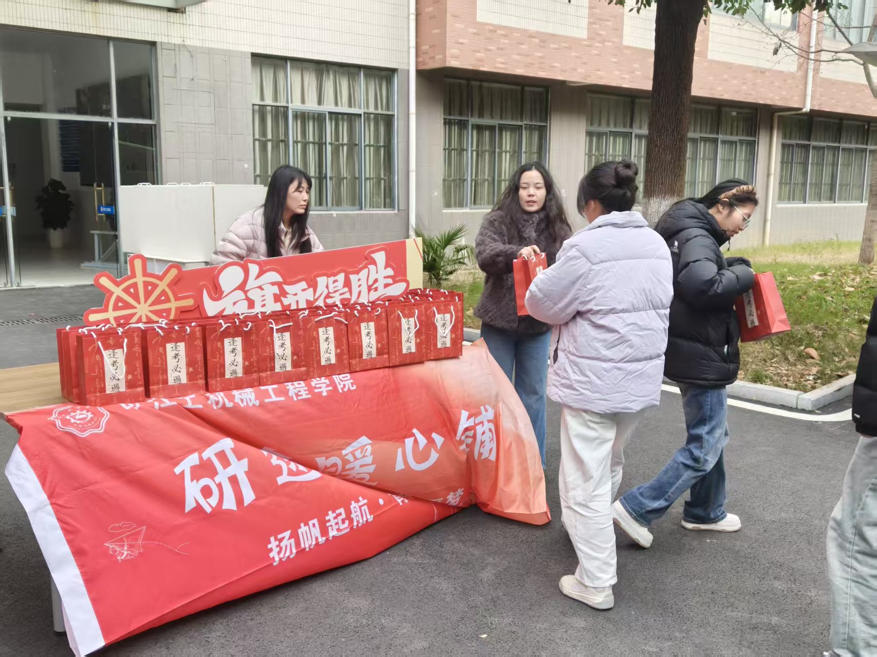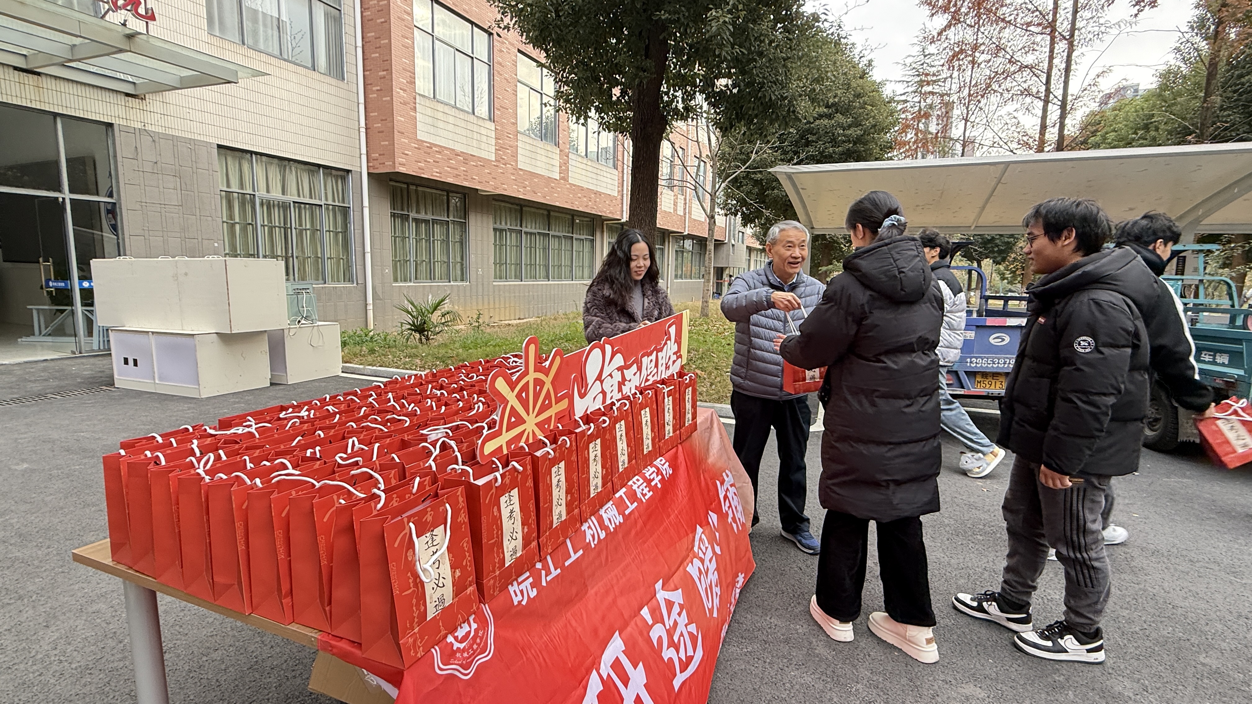 寒冬岁末,考研在即。为缓解学子备考压力、传递学院关怀,2025年12月4日,beat365正版唯一入口必一机械工程学院于敦行楼楼下开展考研慰问活动。学院院长朱天宇、院党总支副书记颜婷婷、院分团委汪娟老师来到活动现场,为冲刺阶段的考研学子送上慰问礼品与暖心祝福。