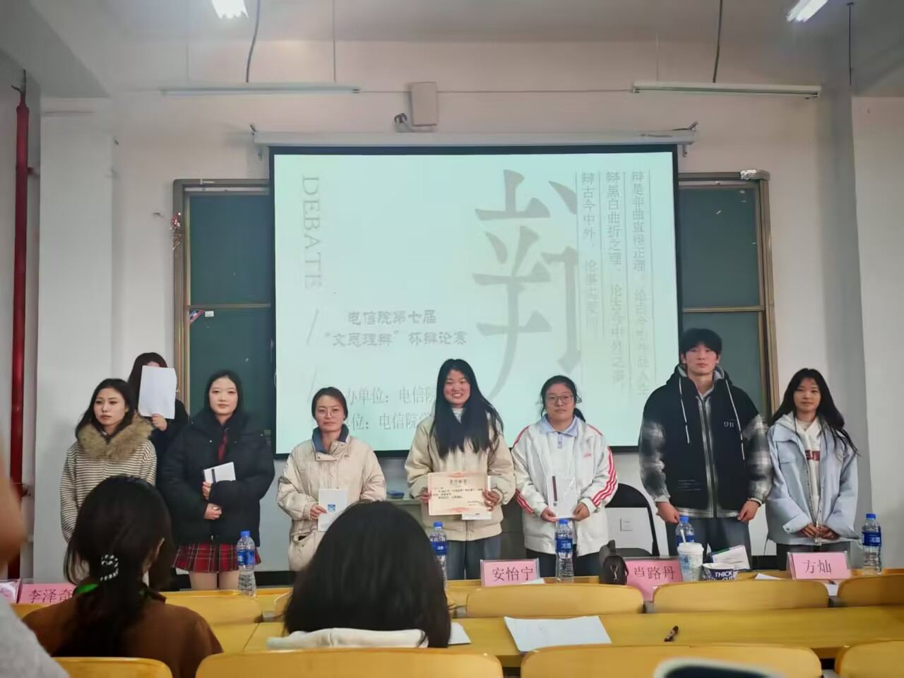 2025年11月30日至12月7日,电信工程学院第七届“文思理辩”辩论赛在学校郑浦港校区B201教室精彩上演。8支新生队伍以言辞为刃、逻辑为锋,历经预赛、半决赛与决赛的层层角逐,在为期两周的赛程中,上演了一场场酣畅淋漓的文思泉涌与思想对决,尽显电信学子的思辨风采与青春朝气。